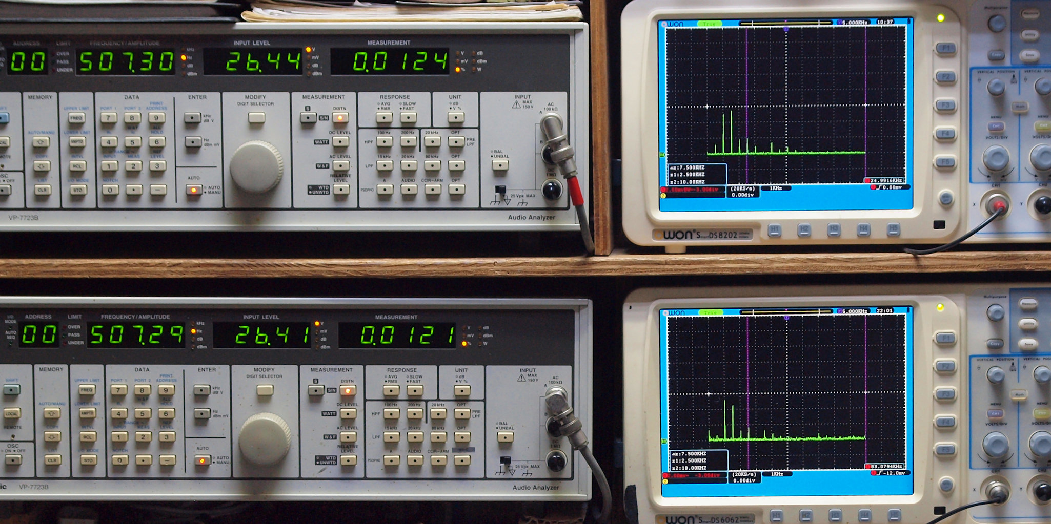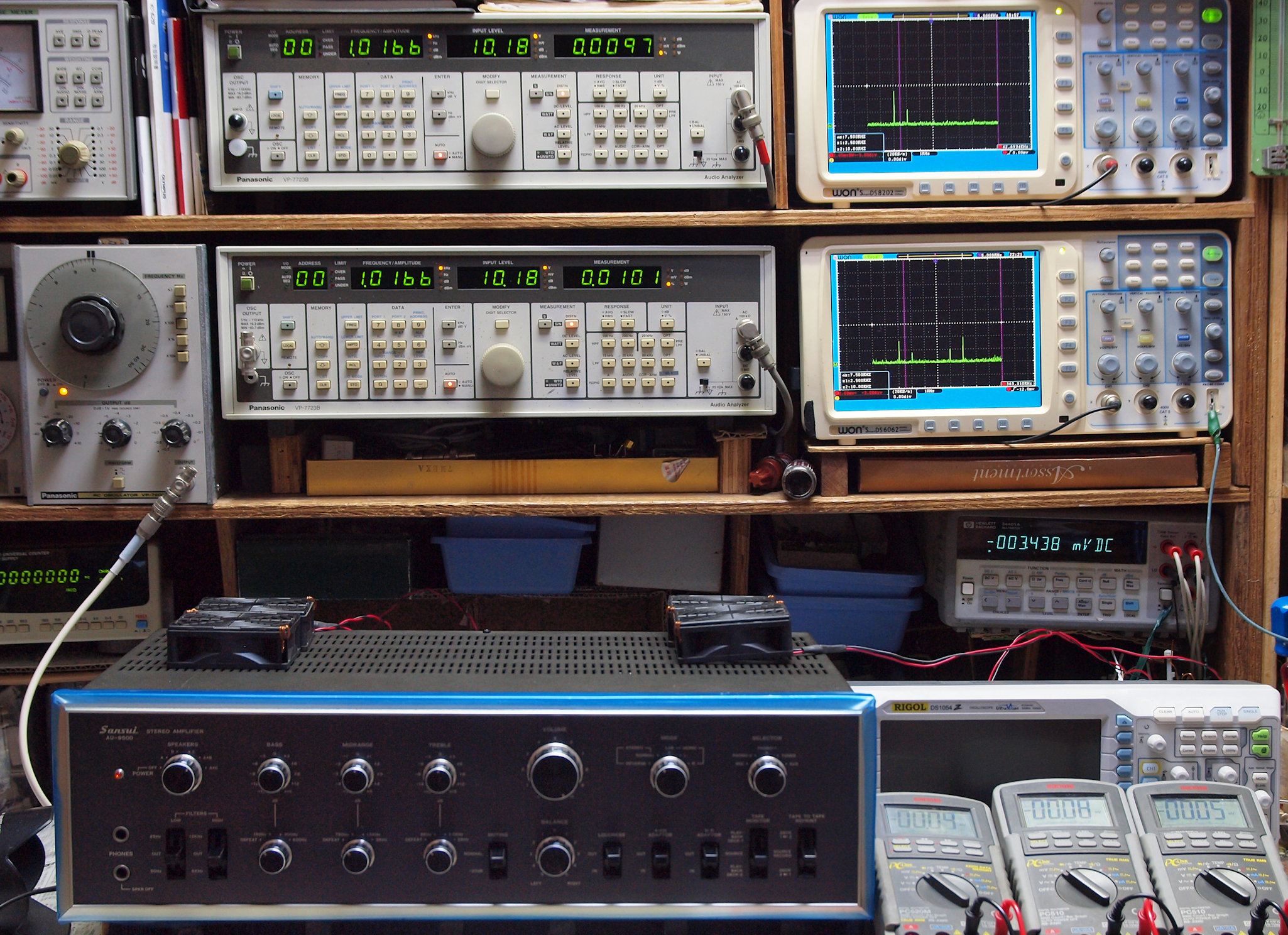 | E. 測定・調整。 画像をクリックすると、大きく(横幅2050ドット)表示されます。 E0. 出力・歪み率測定・調整 「見方」。 上段中 右側SP出力を「Audio Analyzer Panasonic VP−7723B」により測定。 表示LED、 左端=メモリーNo、 中左=周波数測定、 中右=出力電圧測定、 右端=歪み率測定。 上段右端 VP−7723Bの基本波除去出力を「owon SDS8202(200MHZ)」で「FFT分析」表示。 下段中 左側SP出力を「Audio Analyzer Panasonic VP−7723B」により測定。 表示LED、 左端=メモリーNo、 中左=周波数測定、 中右=出力電圧測定、 右端=歪み率測定。 下段右端 VP−7723Bの基本波除去出力を「owon SDS6062(200MHZ)」で「FFT分析」表示。 下段左端 オーディオ発振器 VP−7201A より50Hz〜100kHzの信号を出し(歪み率=約0.003%)、ATT+分配器を通し、AMPに入力。 よって、ダイアル設定出力レベルより低くなります。測定機器の仕様や整備の様子はこちら、「VP−7723B」「VP−7201A」。 FFT画面の見方はこちら。 |