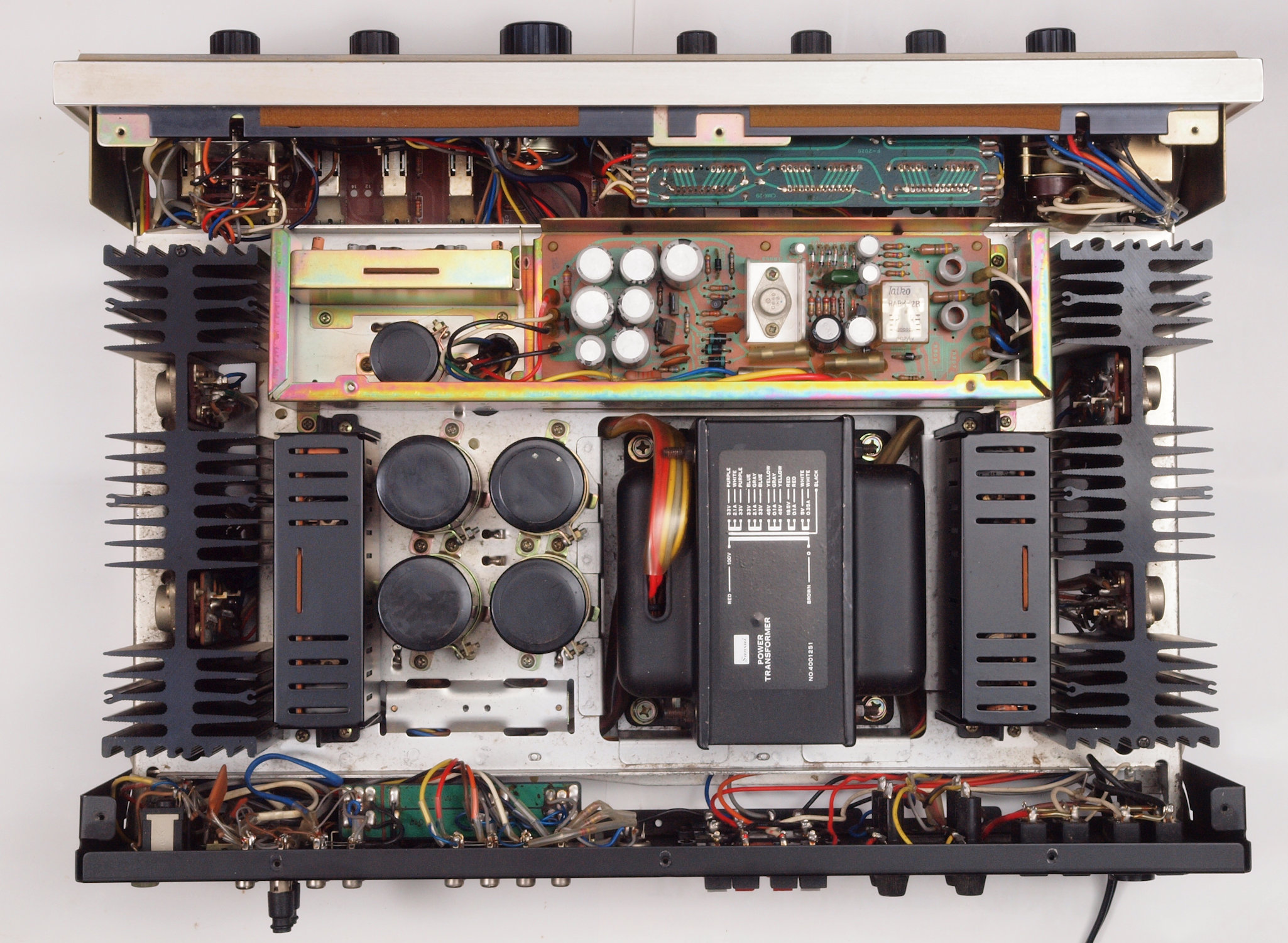 | A24. 点検中 上蓋・シールドを取り、上から見る。 電源ブロック電解コンデンサーの頭の膨らみ無。 | ||||||||||||||||||||||||||||||||||||||||||