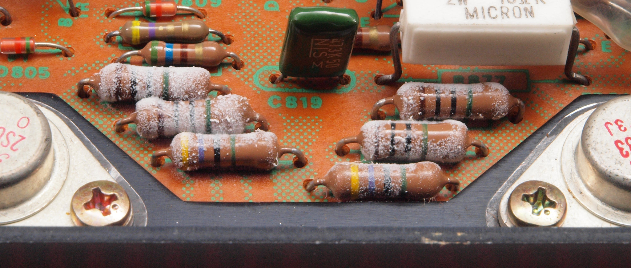 | C312. 修理前 L側終段基板。 抵抗に塩分が結晶? | ||||||||||||||||||||||||||||||||||||||||||
