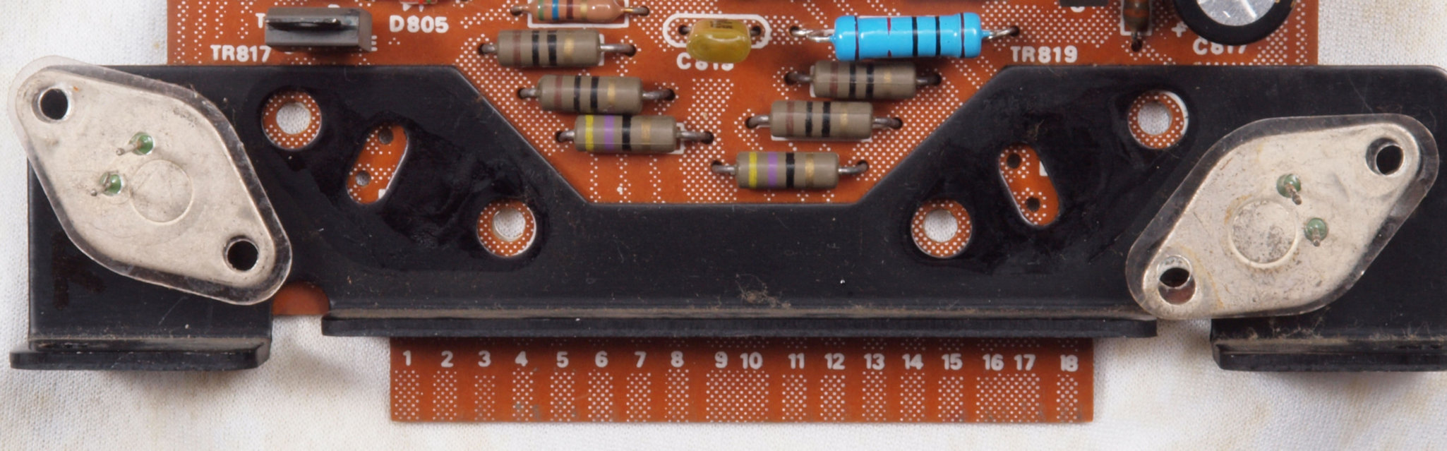 | C21. 修理前 R側終段基板。 半固定VR2個、TR(トランジスター)が2個交換されている。C819とR877が取り除かれている。 | ||||||||||||||||||||||||||||||||||||||||||
