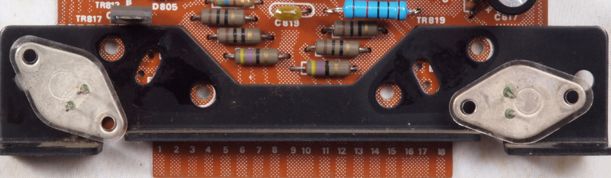 | C31. 修理前 L側終段基板。 半固定VR2個、TR(トランジスター)が2個交換されている。C819とR877が取り除かれている。 | ||||||||||||||||||||||||||||||||||||||||||
