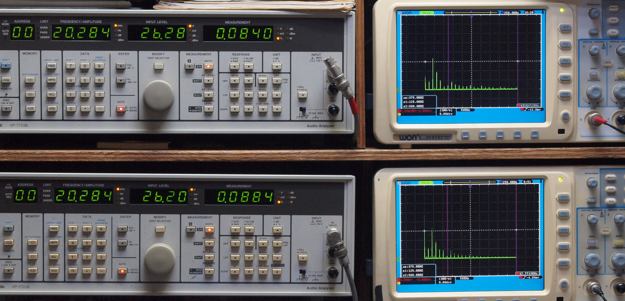 | E. 測定・調整。 画像をクリックすると、大きく(横幅2050ドット)表示されます。 E0. 出力・歪み率測定・調整 「見方」。 上段中 右側SP出力を「Audio Analyzer Panasonic VP−7723B」により測定。 表示LED、 左端=メモリーNo、 中左=周波数測定、 中右=出力電圧測定、 右端=歪み率測定。 上段右端 VP−7723Bの基本波除去出力を「owon SDS8202(200MHZ)」で「FFT分析」表示。 下段中 左側SP出力を「Audio Analyzer Panasonic VP−7723B」により測定。 表示LED、 左端=メモリーNo、 中左=周波数測定、 中右=出力電圧測定、 右端=歪み率測定。 下段右端 VP−7723Bの基本波除去出力を「owon SDS6062(200MHZ)」で「FFT分析」表示。 下段左端 オーディオ発振器 VP−7201A より50Hz〜100kHzの信号を出し(歪み率=約0.003%)、ATT+分配器を通し、AMPに入力。 よって、ダイアル設定出力レベルより低くなります。測定機器の仕様や整備の様子はこちら、「VP−7723B」「VP−7201A」。 FFT画面の見方はこちら。 |