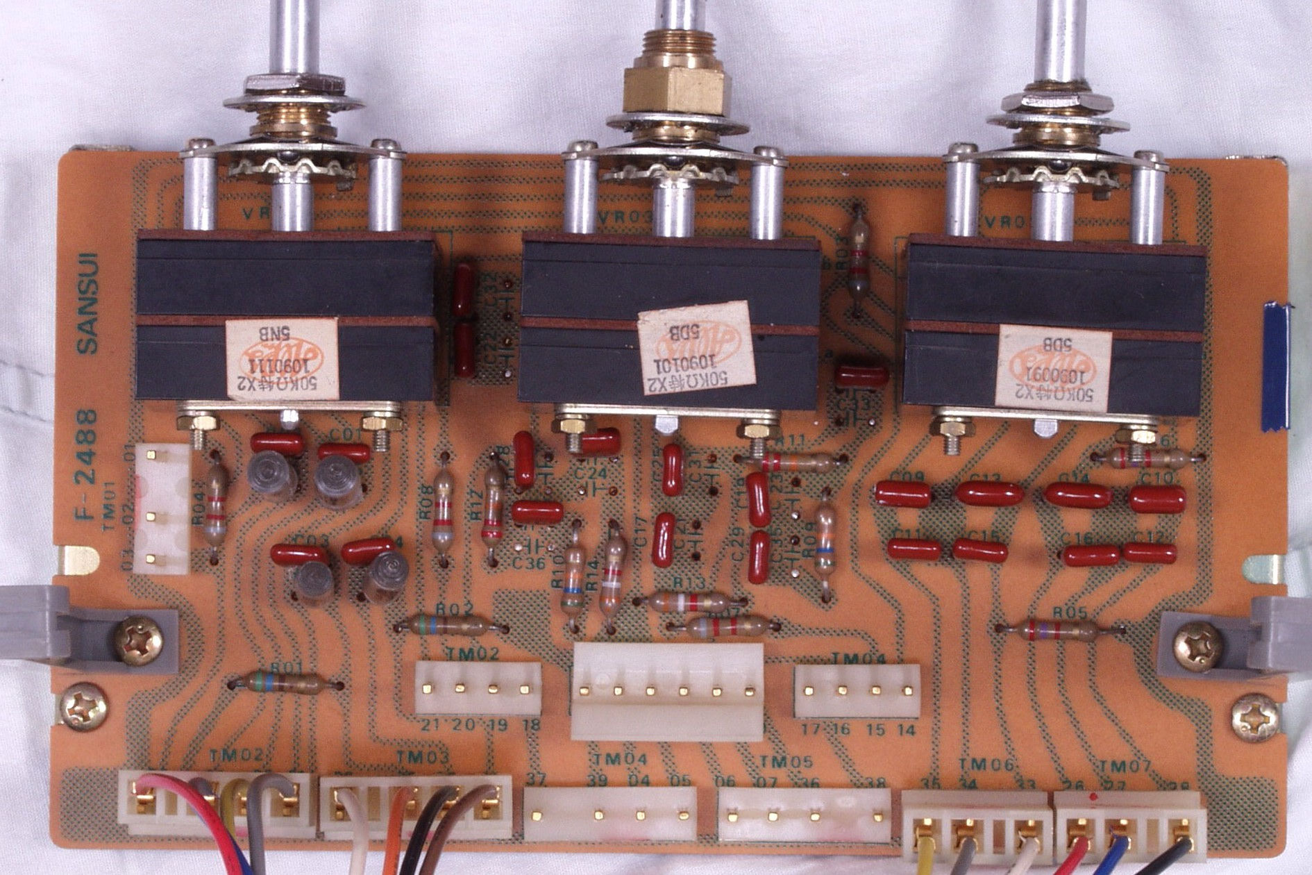 | C−7B. 修理後 L−EQ−AMP基板 TR(トランジスター)3個、電解コンデンサー10個交換 |