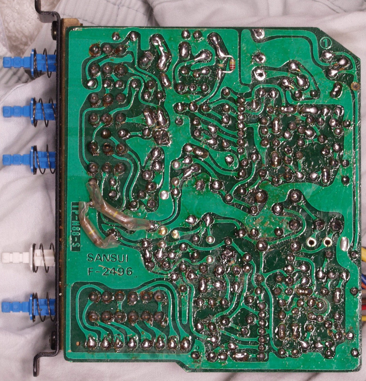 | C−2C. 修理前 メイン基板裏 色が変化している所は、接点復活材を吹いた後 |