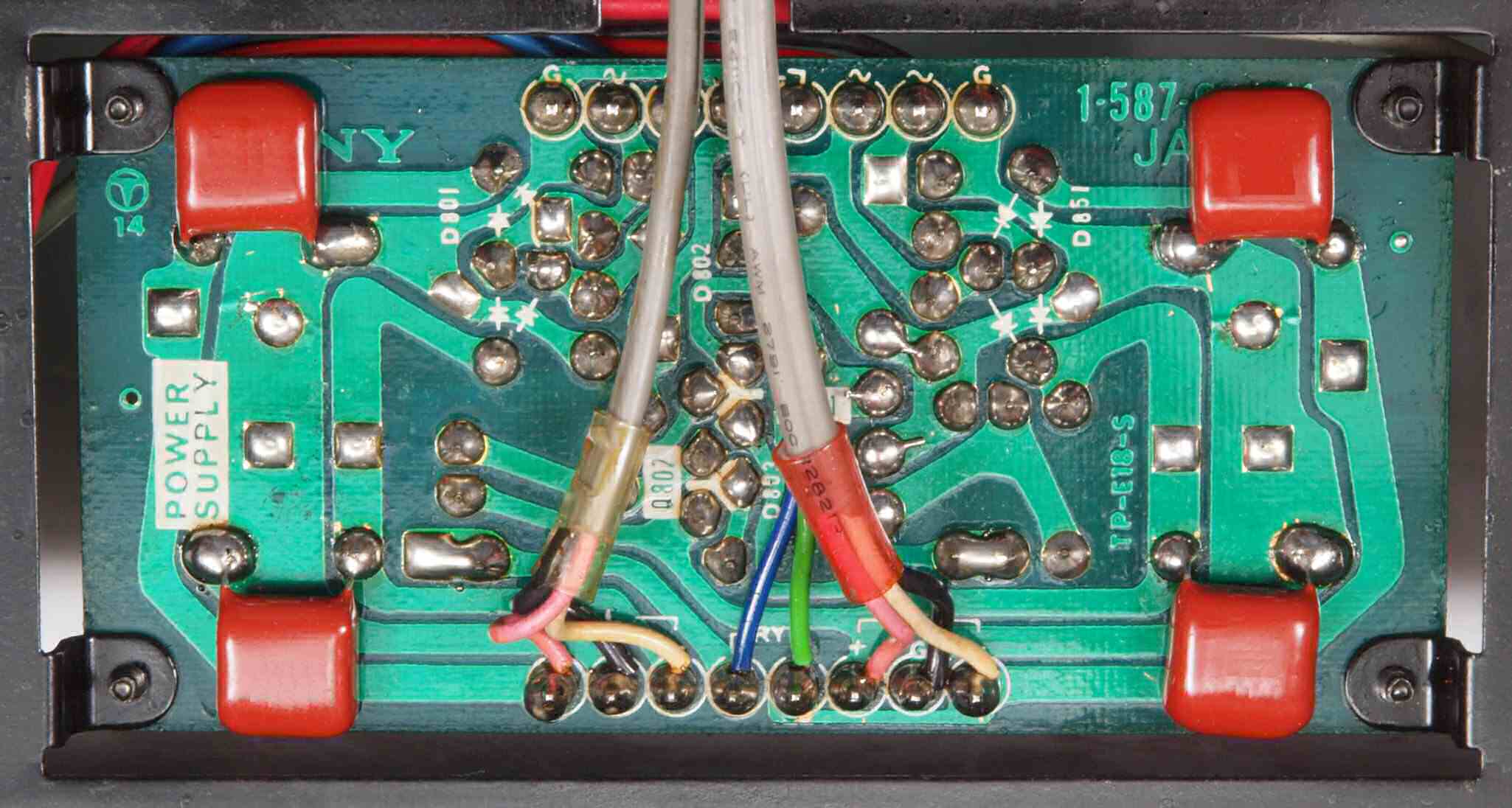 | C34. 修理(半田補正)後 電源基板裏。 半田を全部やり直す、普通はこれで完成。 フイルムコンデンサー4個追加。 | ||||||||||||||||||||||||||||||||||||