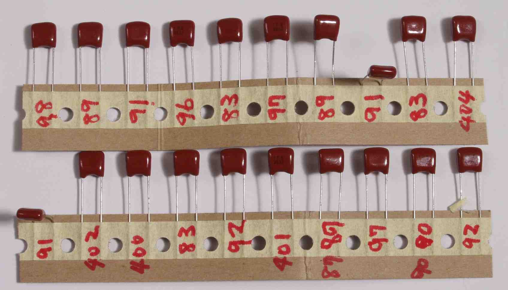 | A4. 点検中 フイルムコンデンサーの比較 上=使用されている物 下右=現在の物 下左=積層セラミック | ||||||||||||||||||||||||||||||||||||