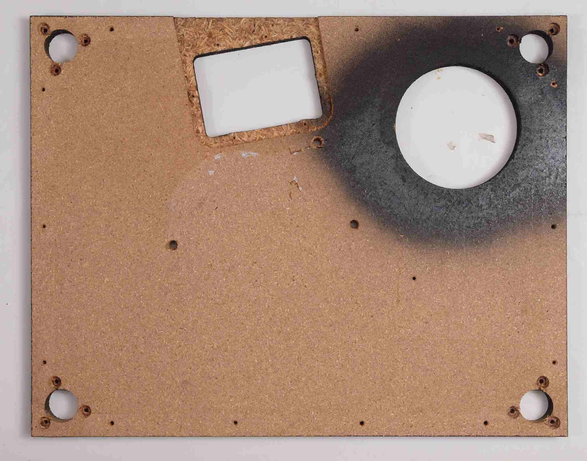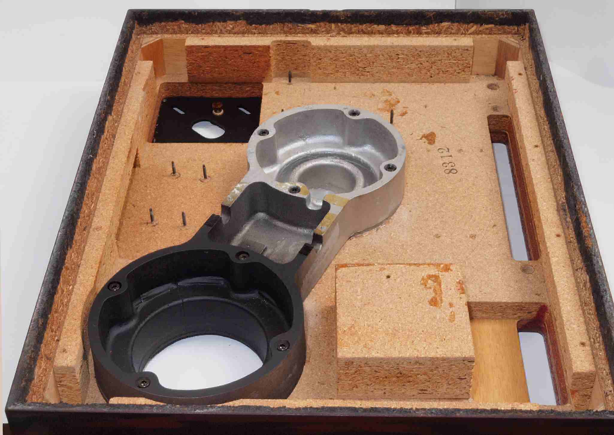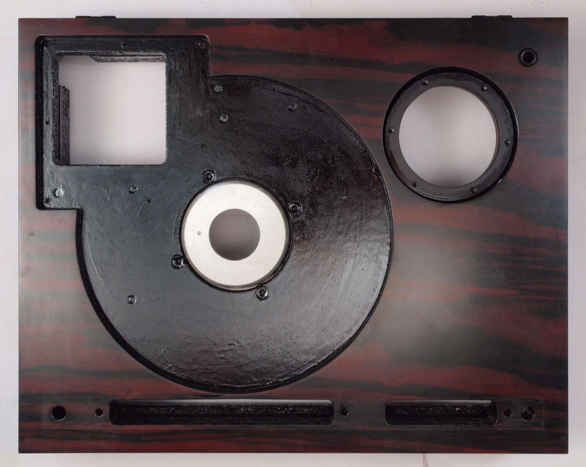 | W. 下蓋及び本体木部 修理状況。 W01. 修理前 タンテーブル軸ユニットを外した本体。アーム取付一体シャーシは接着して有るのでそのまま。 |