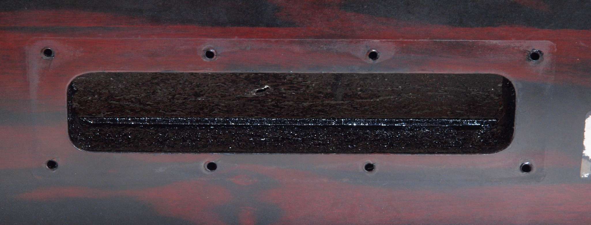 | W76. 修理(塗装)後 底板裏側、 トランスカバーを取付ける所、反対側。キズを消す為と割れを防ぐのに、ペンキを塗る。 |