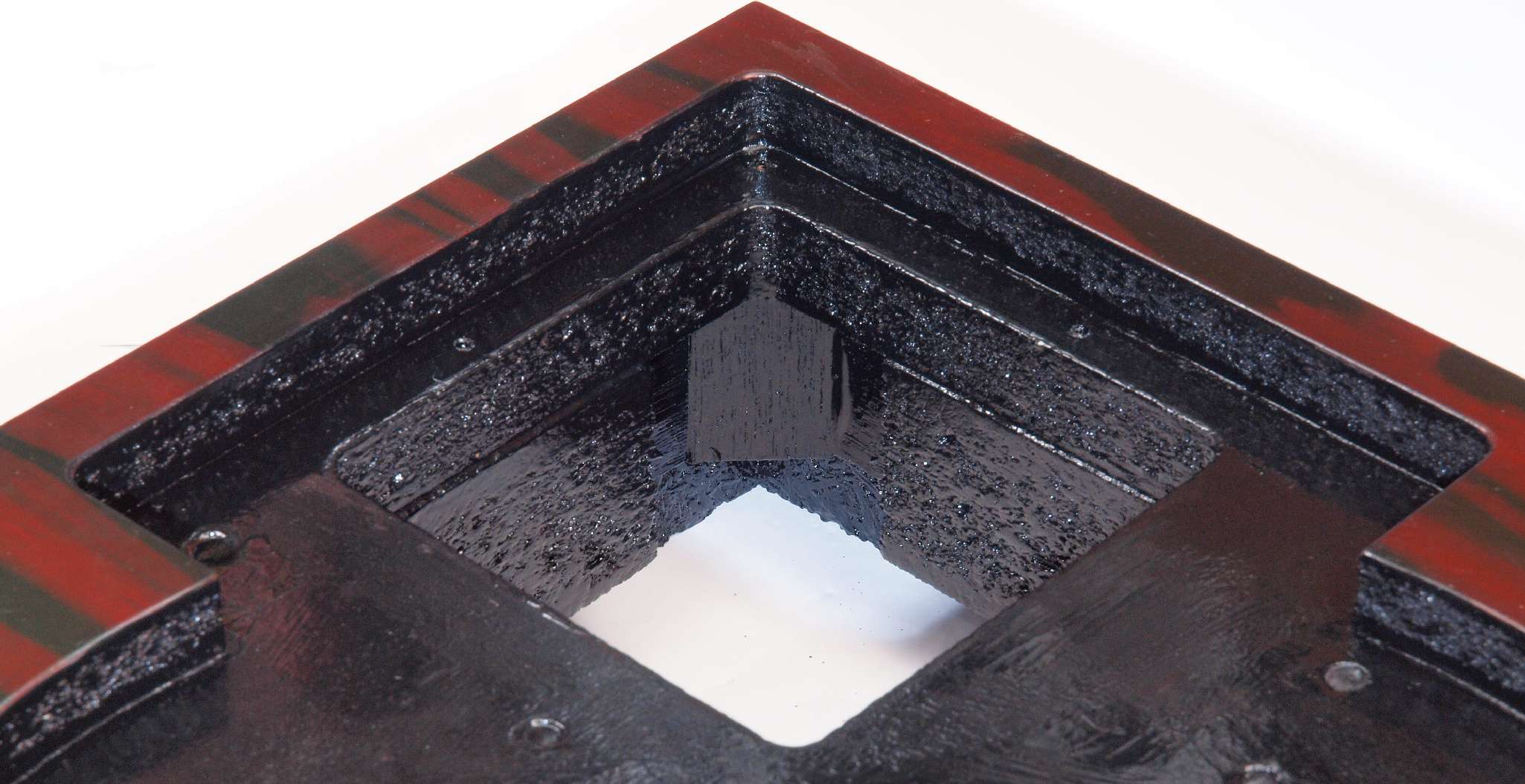 W7C. 修理中 底板裏側、アーム取り付け穴、反対側。さらに、キズを消す為と割れを防ぐのに、ペンキを塗る。