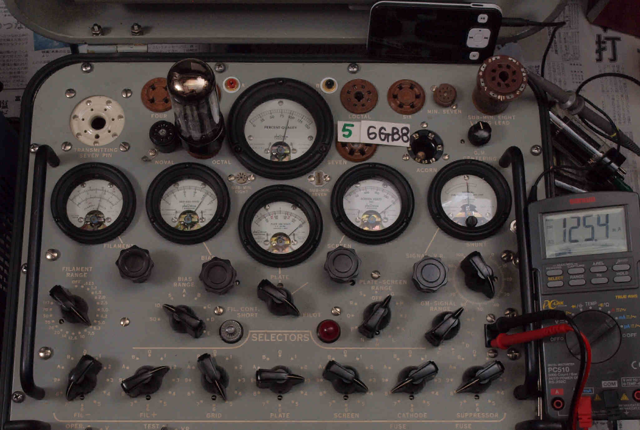 | A9. 9本目 6G-B8 測定。 Gm=16600μmho、Ip=126.1mA。RangeSW=A、FullScale=30000μmho。 測定条件、 「Ep=250V、Esg=250V、Eg1=−8V」 |