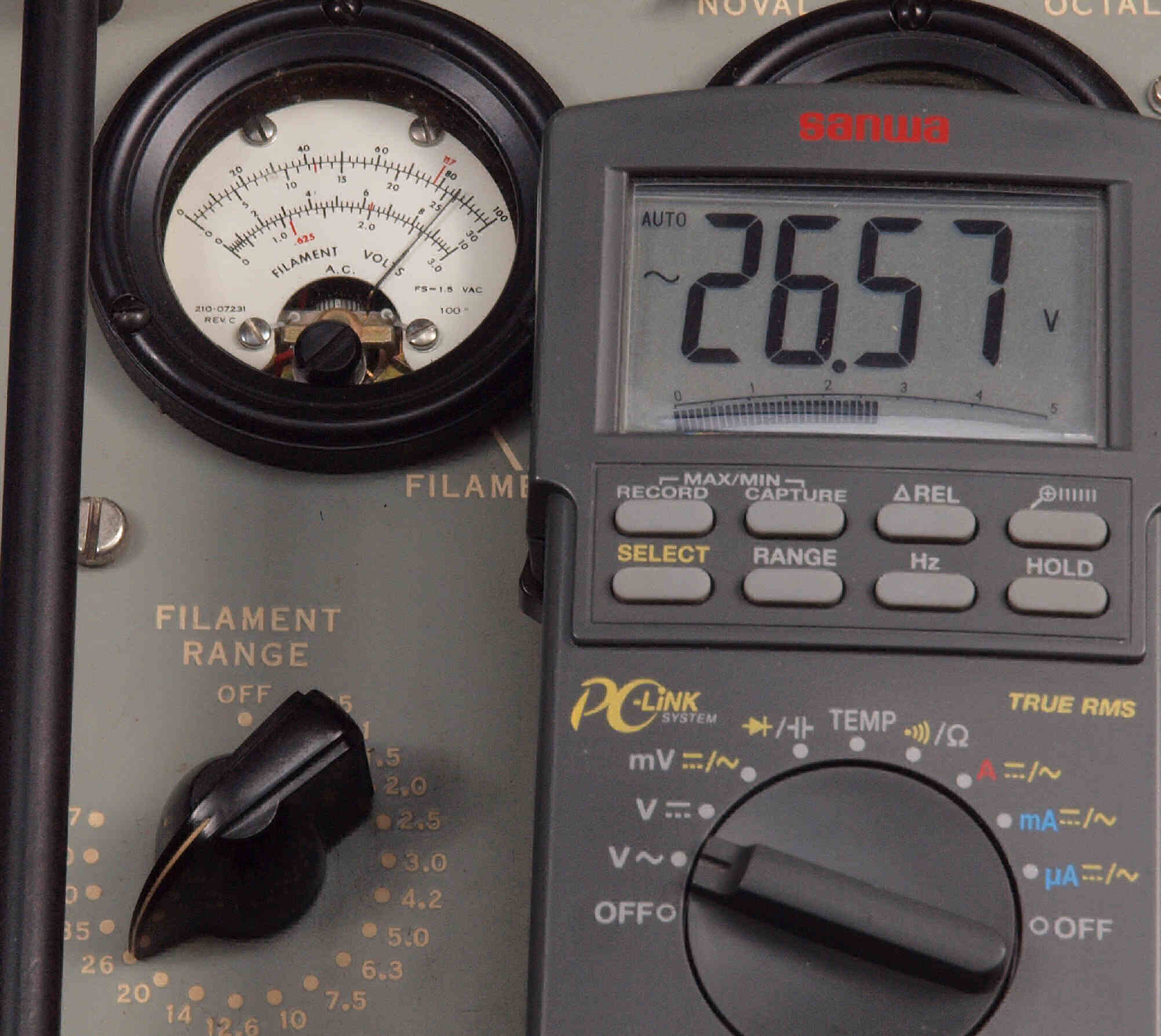 | 「整流管83」、「整流管5Y3GT」をダイオードに単純に交換すると、電源が強化する事になり、相互コンダクタンスの測定には信頼性(精度)が増すことになります。 しかし、チャートのAver.Mut.Cond.とは誤差がでます。又、他の試験方法にも誤差がでます。よって、回路の変更、全体的な調整・校正が必要となります。 | |||||||||||||||||||||||||||||||||