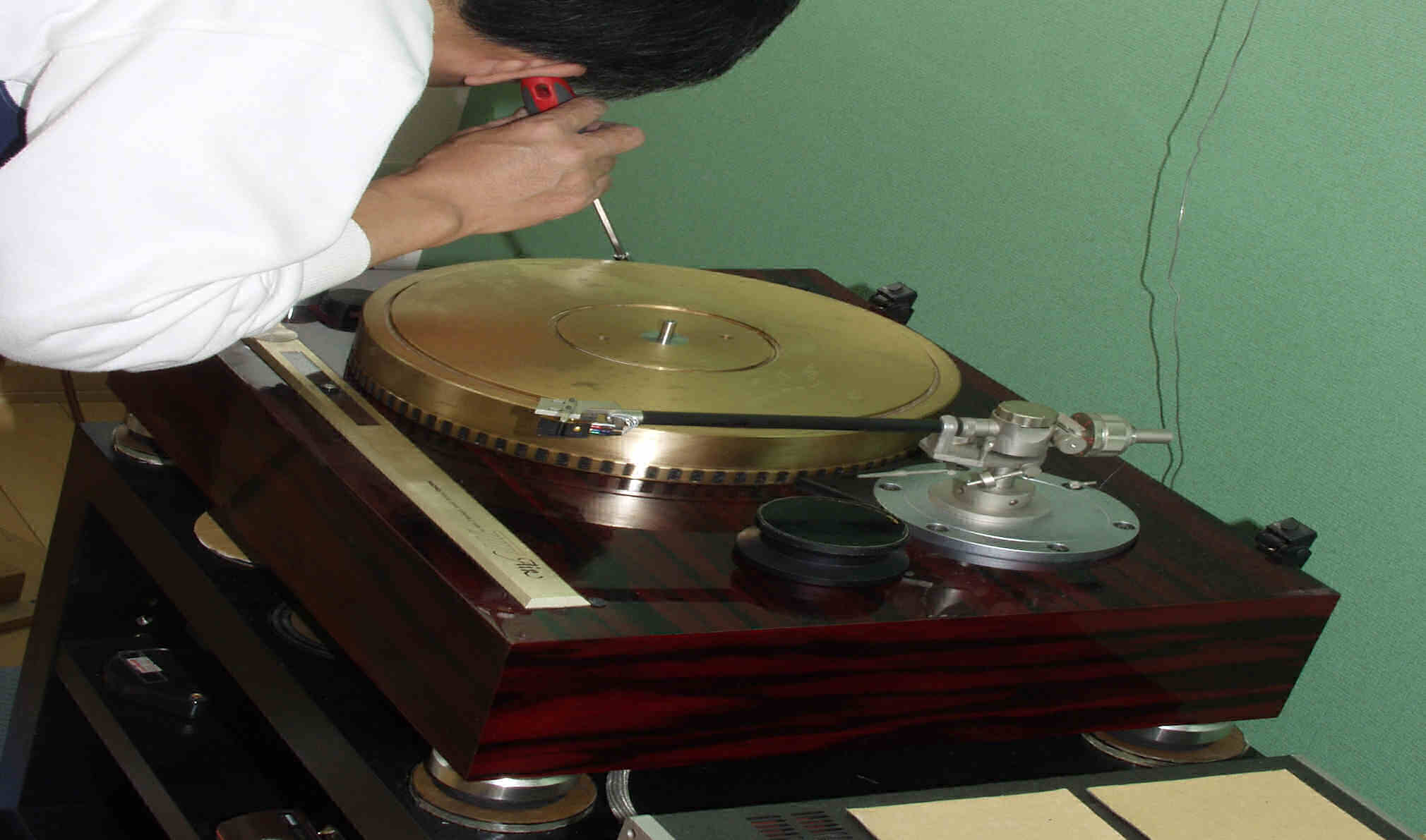 | 1A.下記の様に、大きな金属製のドライバーをタンテーブルの金属部分に「ドライバー等」を当て、音を聞いてください 1B.次にターンテーブルへのベルトを外して、モーターのみ回転させ、同じ様に音を聞いてください。 写真では「ストロボ撮影」の為、ターンテーブルの回転が止ま見えます。 |