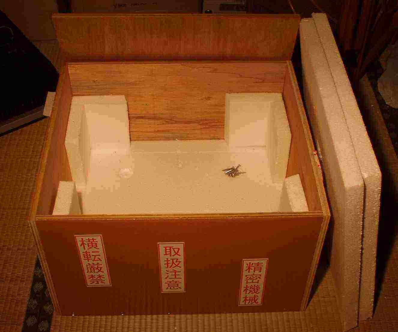架台に固定し、木箱で覆い、ダンボールで梱包した例   修理の様子はこちら