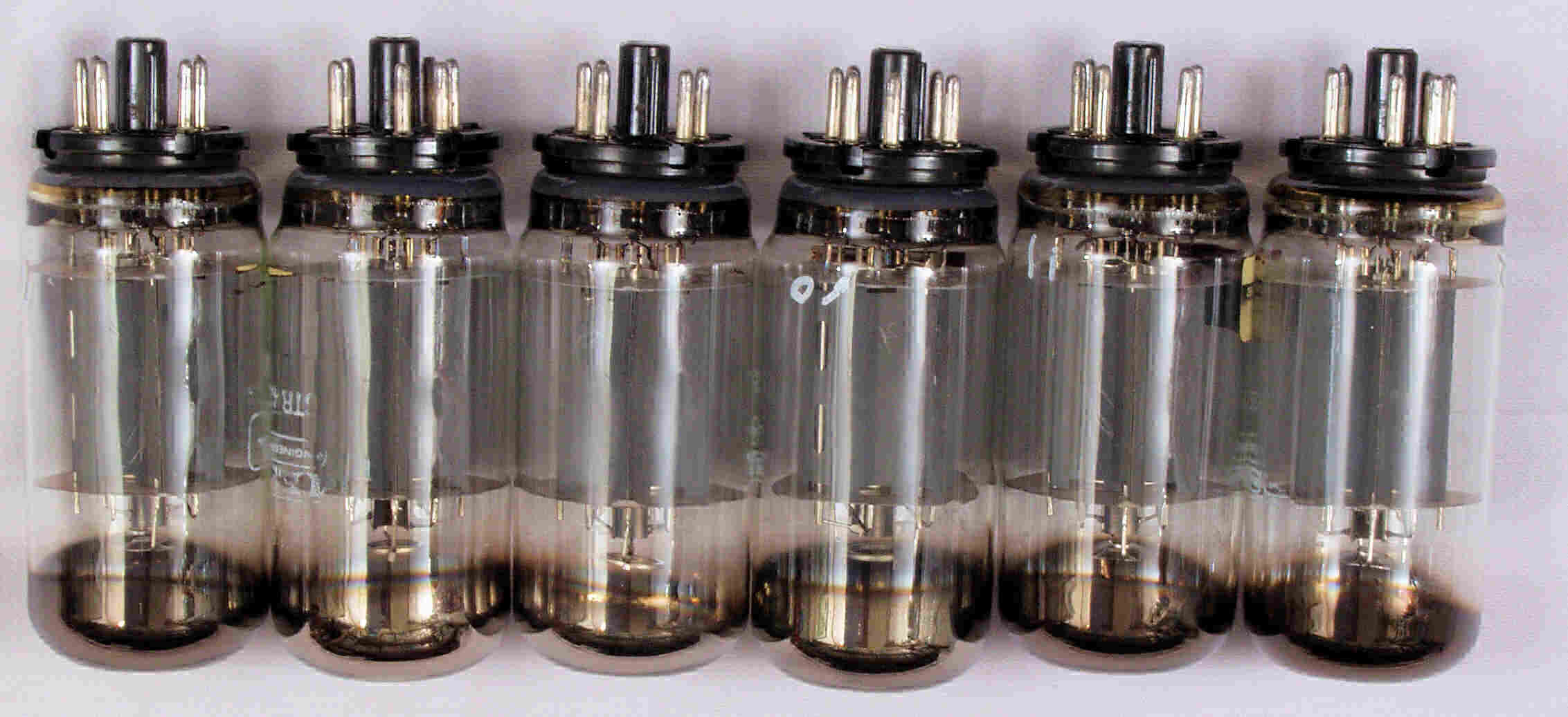 | CA3. 付属出力真空管 STR425 「5881=6L6」。 左から予備球.1本目.2本目.4本目..6本目。 管壁の黒ずんだ所は、プレートが赤熱時放出した部質が蒸着した物。 |