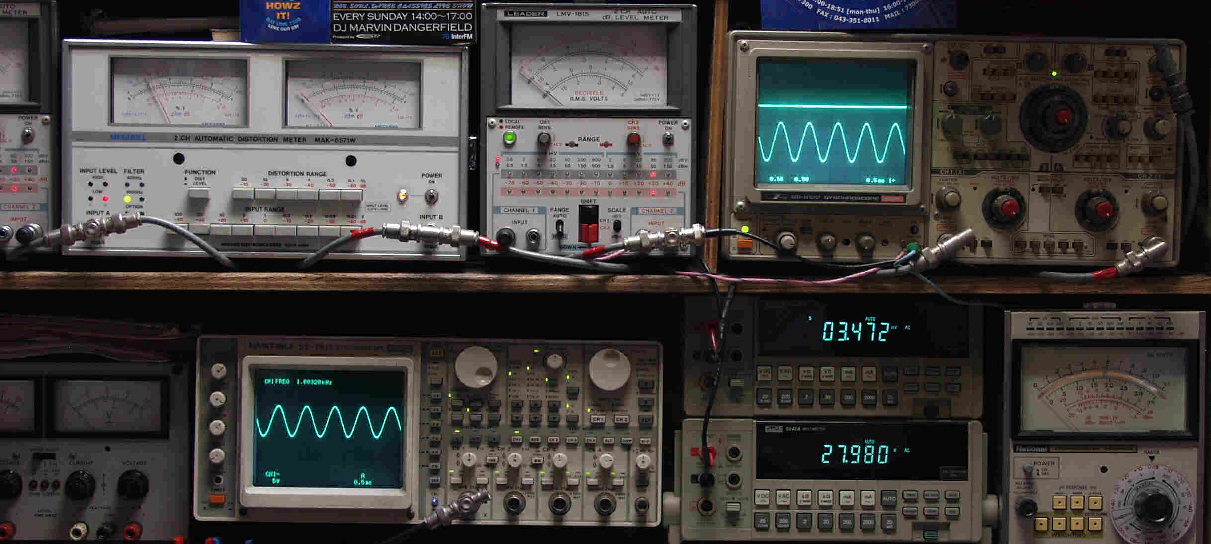 | E. 調整・測定 E1. 出力・歪み率測定・調整 <見方> 下段左端 オーディオ発振器より400HZ・1KHZの信号を出し(歪み率=約0.003%)これをAMPに入力し、出力を測定 下段中左 オシロ=入力波形(オーディオ発振器のTTLレベル) 下段中右上=周波数計 上段左端 電圧計=L側出力電圧測定、黒針のみ使用 上段中左 歪み率計=出力の歪み率測定 左メータ=L出力、右メータ=R出力 上段中右 電圧計=R側出力電圧測定、赤針のみ使用 上段右端 オシロ=出力波形 上=R出力、下=L出力(実際にはRL電圧計の出力「Max1V」を観測) 下段中右上 デジタル電圧計=R出力電圧測定 下段中右下 デジタル電圧計=L出力電圧測定 |