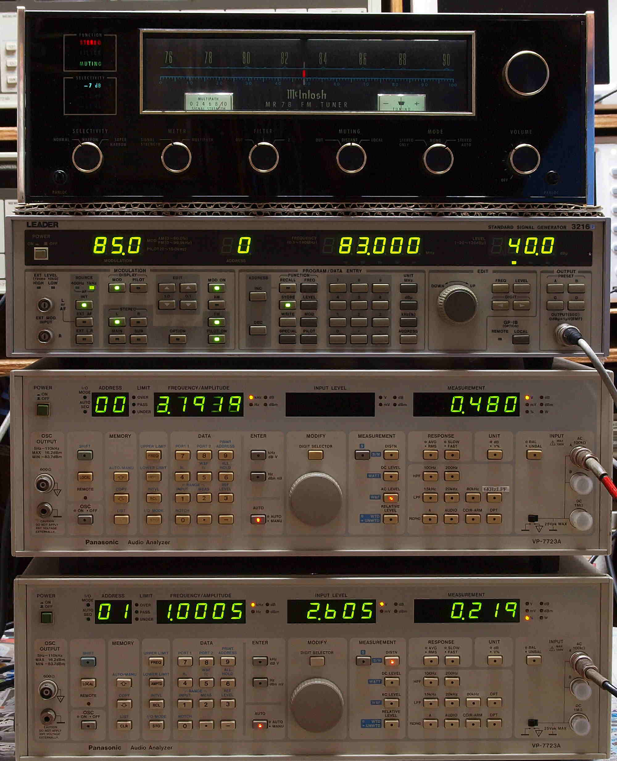 上の「LEADER 3216P FM ステレオ信号発信器」より信号を出す。 これを受信し出力を測定する。