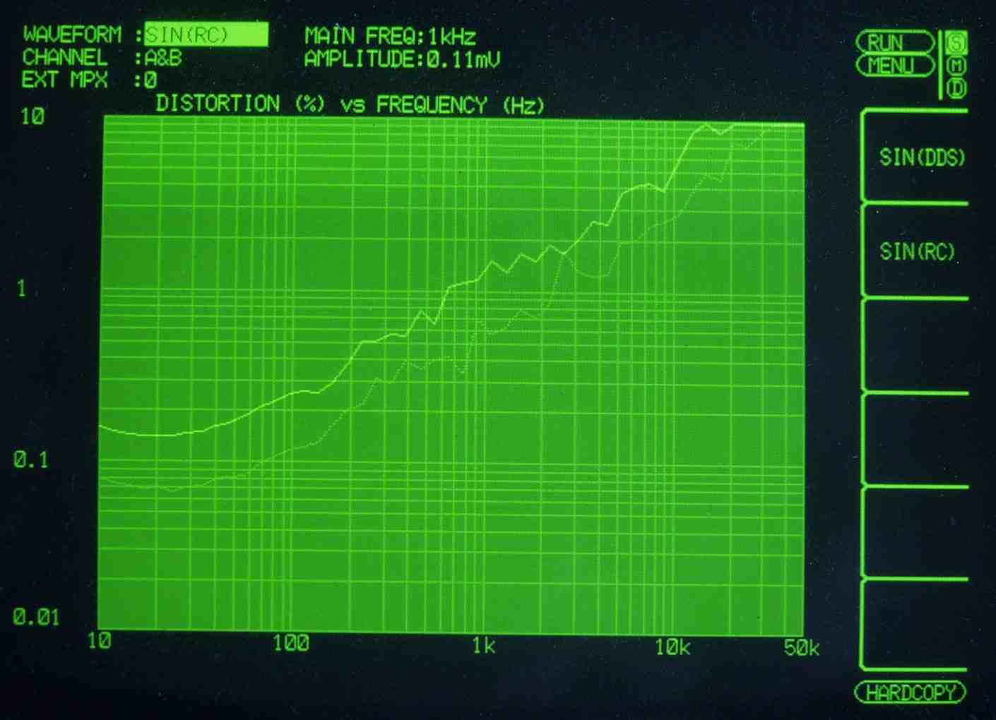 | HF4. 歪み率測定(MM入力)=PHONO−3 左出力=薄(細い)色 右出力=濃い(太い)色 MC入力端子へ=2mV一定入力 VRはmax この測定器は入力レベルが変化すると、正しく測定できない、 入力に逆RIAAフイルターを入れ、入力レベルを一定にしないと、正確な測定は出来ないので参考程度 |