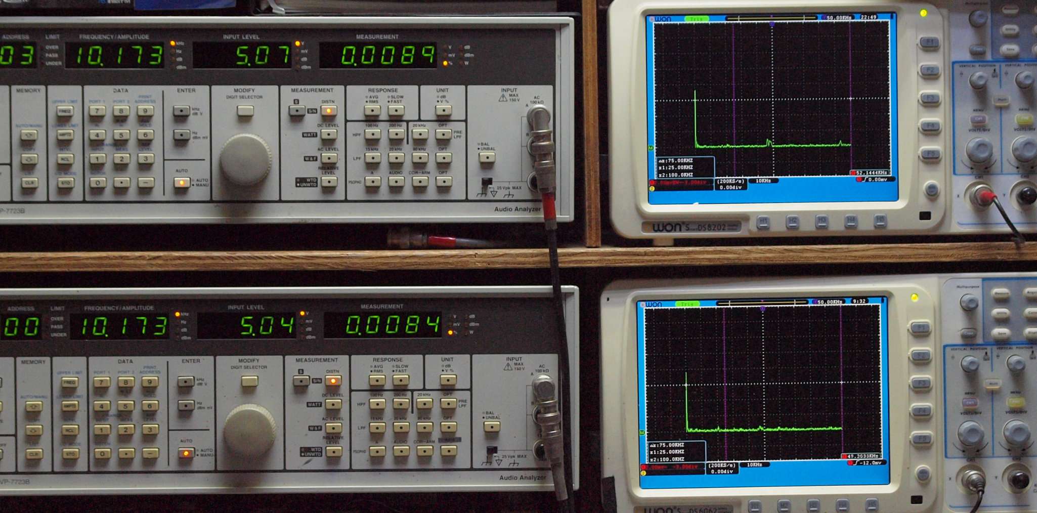 | E. 調整・測定。 画像をクリックすると、大きく(横幅2050ドット)表示されます。 E0. 出力・歪み率測定・調整。 「見方」。 上段中 右側出力を「Audio Analyzer Panasonic VP−7723B」により測定。 表示LED、 左端=メモリーNo、 中左=周波数測定、 中右=出力電圧測定、 右端=歪み率測定。 上段右端 VP−7723Bの基本波除去出力を「owon SDS8202(200MHZ)」で「FFT分析」表示。 下段中 左側出力を「Audio Analyzer Panasonic VP−7723B」により測定。 表示LED、 左端=メモリーNo、 中左=周波数測定、 中右=出力電圧測定、 右端=歪み率測定。 下段右端 VP−7723Bの基本波除去出力を「owon SDS6062(200MHZ)」で「FFT分析」表示。 下段左端 オーディオ発振器 VP−7201A より50Hz〜100kHzの信号を出し(歪み率=約0.003%)、ATT+分配器を通し、AMPに入力。 よって、ダイアル設定出力レベルより低くなります。測定機器の仕様や整備の様子はこちら、「VP−7723B」「VP−7201A」。 FFT画面の見方はこちら。 |