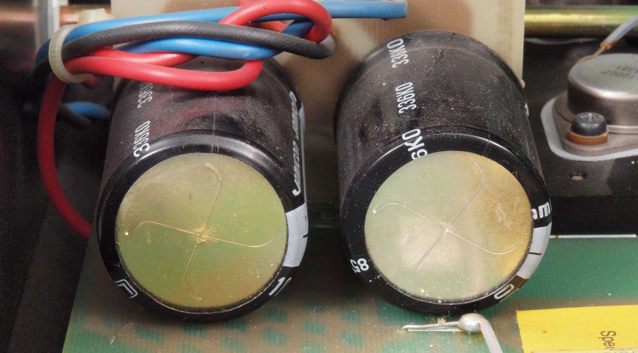 | A44. 本体点検中 電源ブロック電解トランジスター2の頭のビニール剥け。 | ||||||||||||||||||||