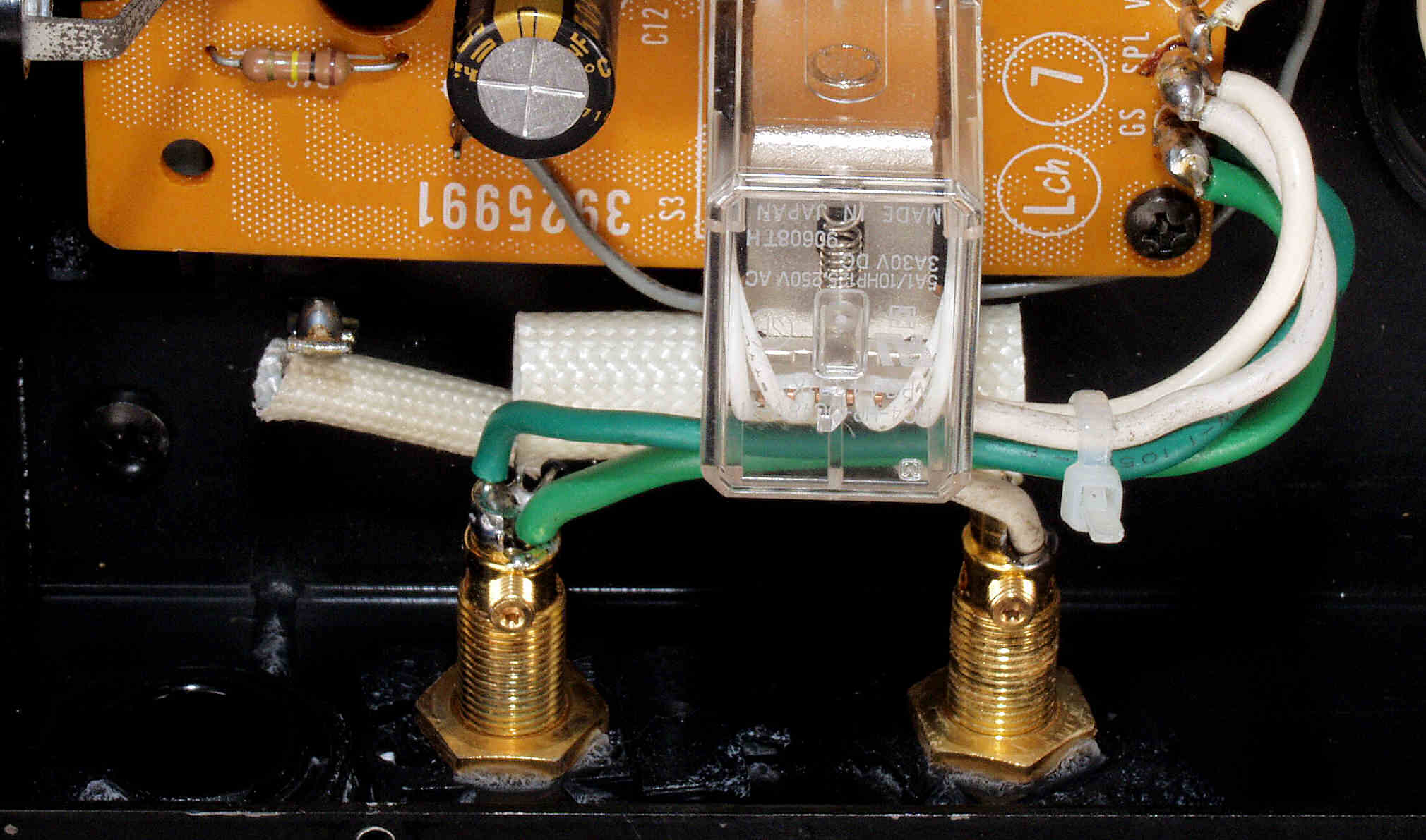 | 注意 このAMPはアースラインが浮いています。 AMPのシャーシにSPの線(アース側)や入力のRCAプラグのアース側も接続してはいけません。 RL−SPのアース線も接続(共通)してもいけません。 本機の様に、電源コードがシールド(アース)付きの場合、シールド(アース)は本体かプラグのどちらかで外す事。 又、DC(directconnection)入力が可能ですが、絶対に使用しないこと=ここ参照 |