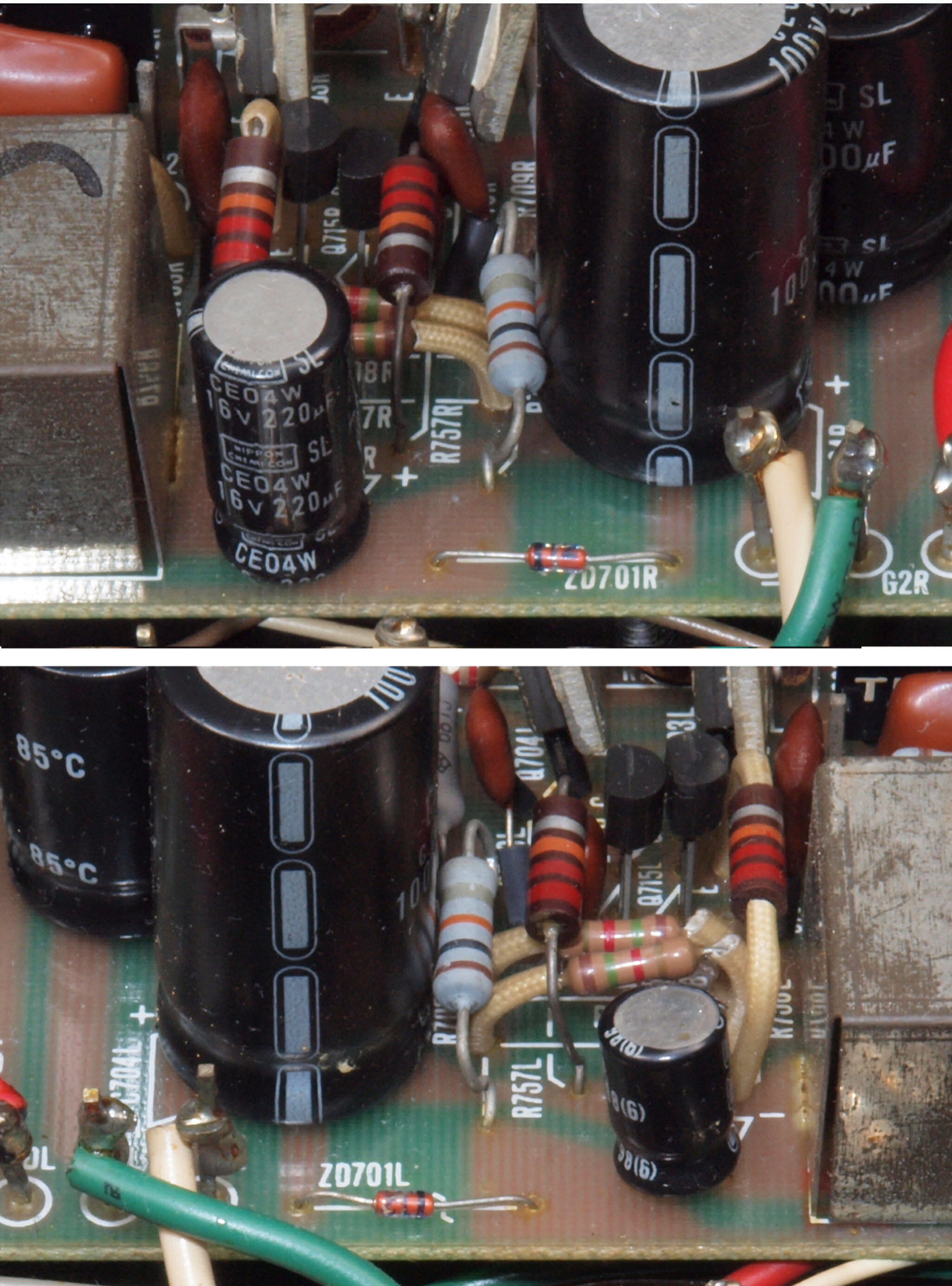 - 左右アンプ基板の電解コンデンサーが異なる! 製造時からか? 上=右側基板220μF/16V、上=左側基板47μF/25V。