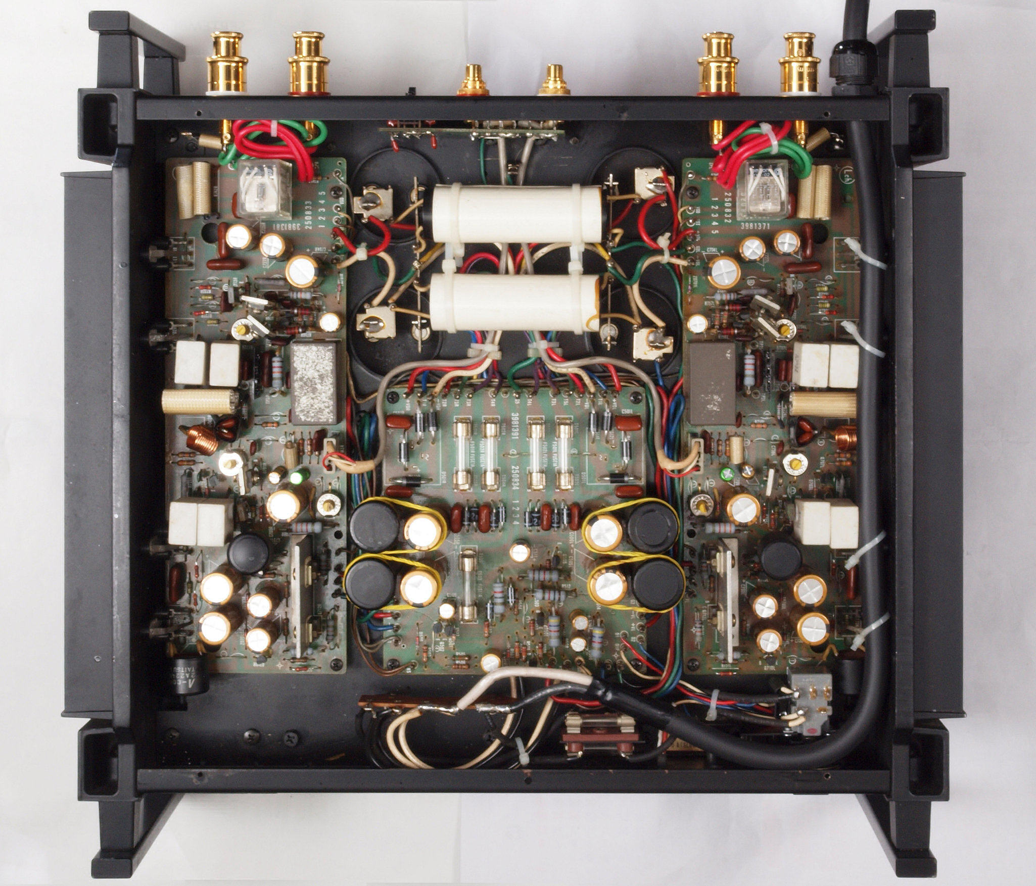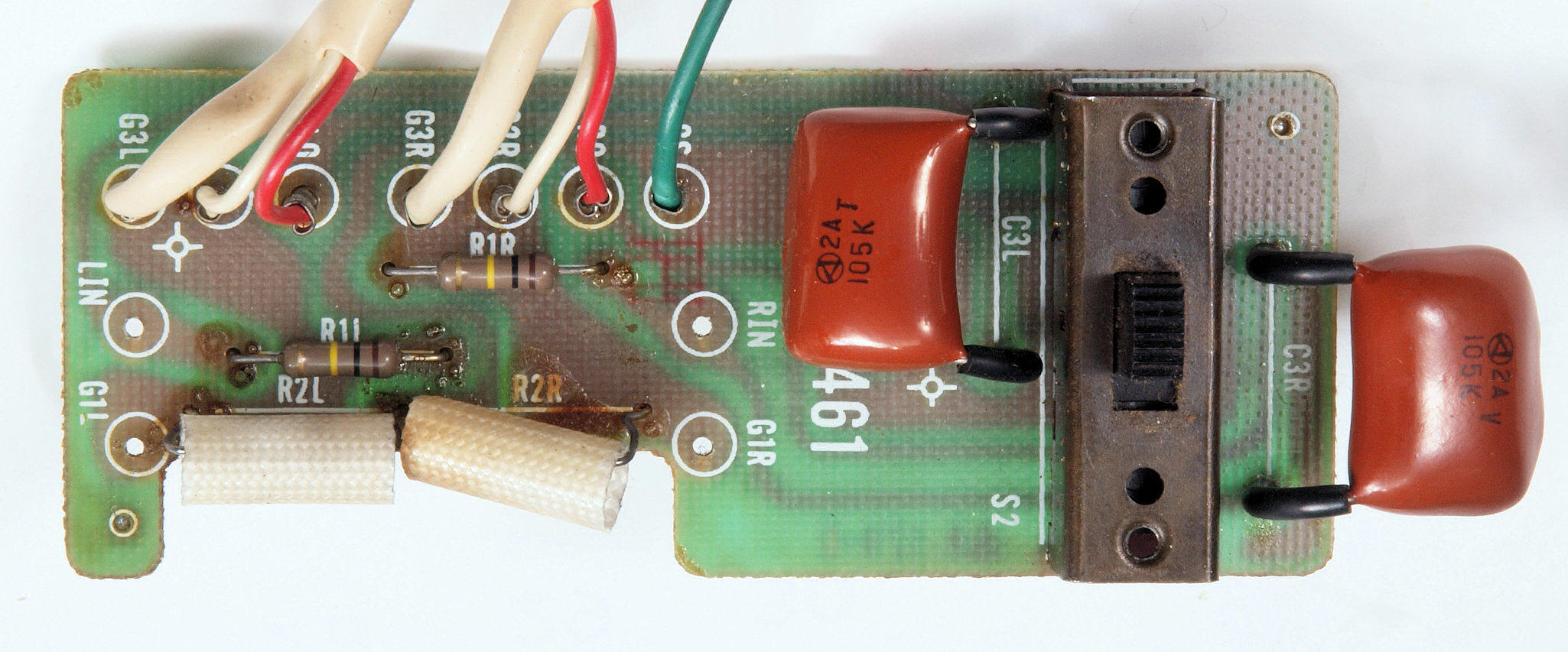 | C72. 修理後 入力RCA端子基板。 フイルムコンデンサー2個交換。 |