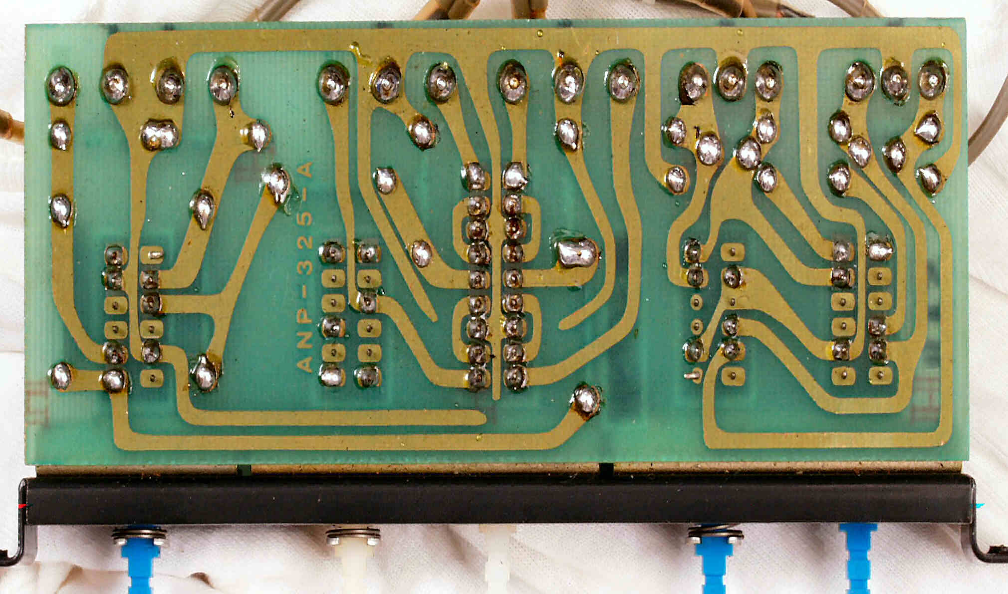 C14. 修理(半田補正)後 R−AMP基板裏 半田を全部やり直す、銅箔は厚いので熱容量の大きいハンダ鏝使用