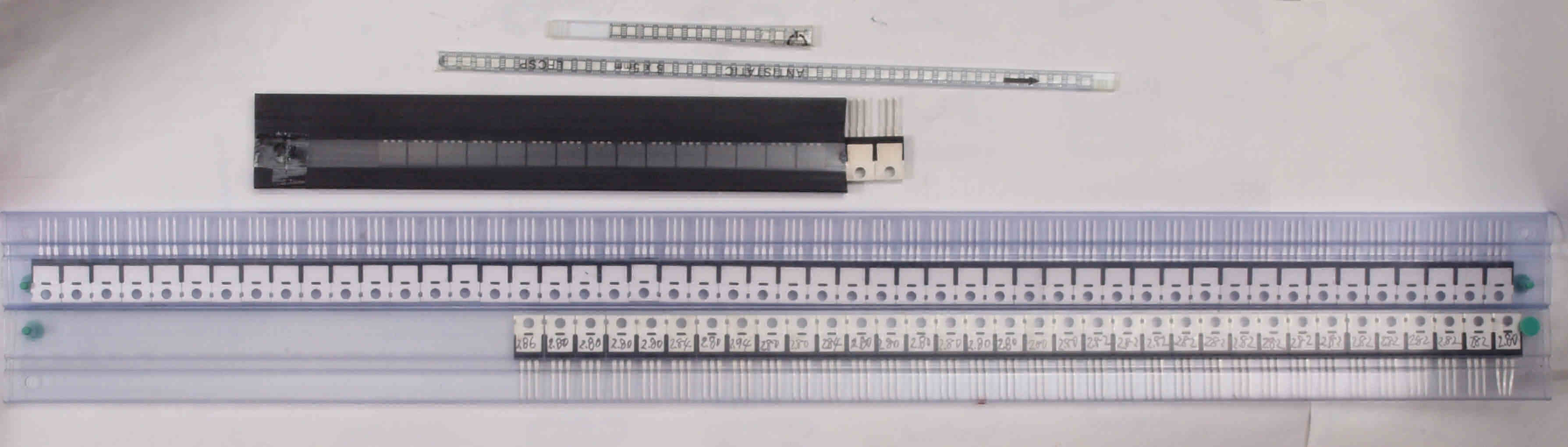 | A43. 点検中 さらにもう1レーン購入した終段FET(電界効果トランジスター)。上の小さい列はドライブIC。 中の黒いのは後発のFET(電界効果トランジスター)。 |