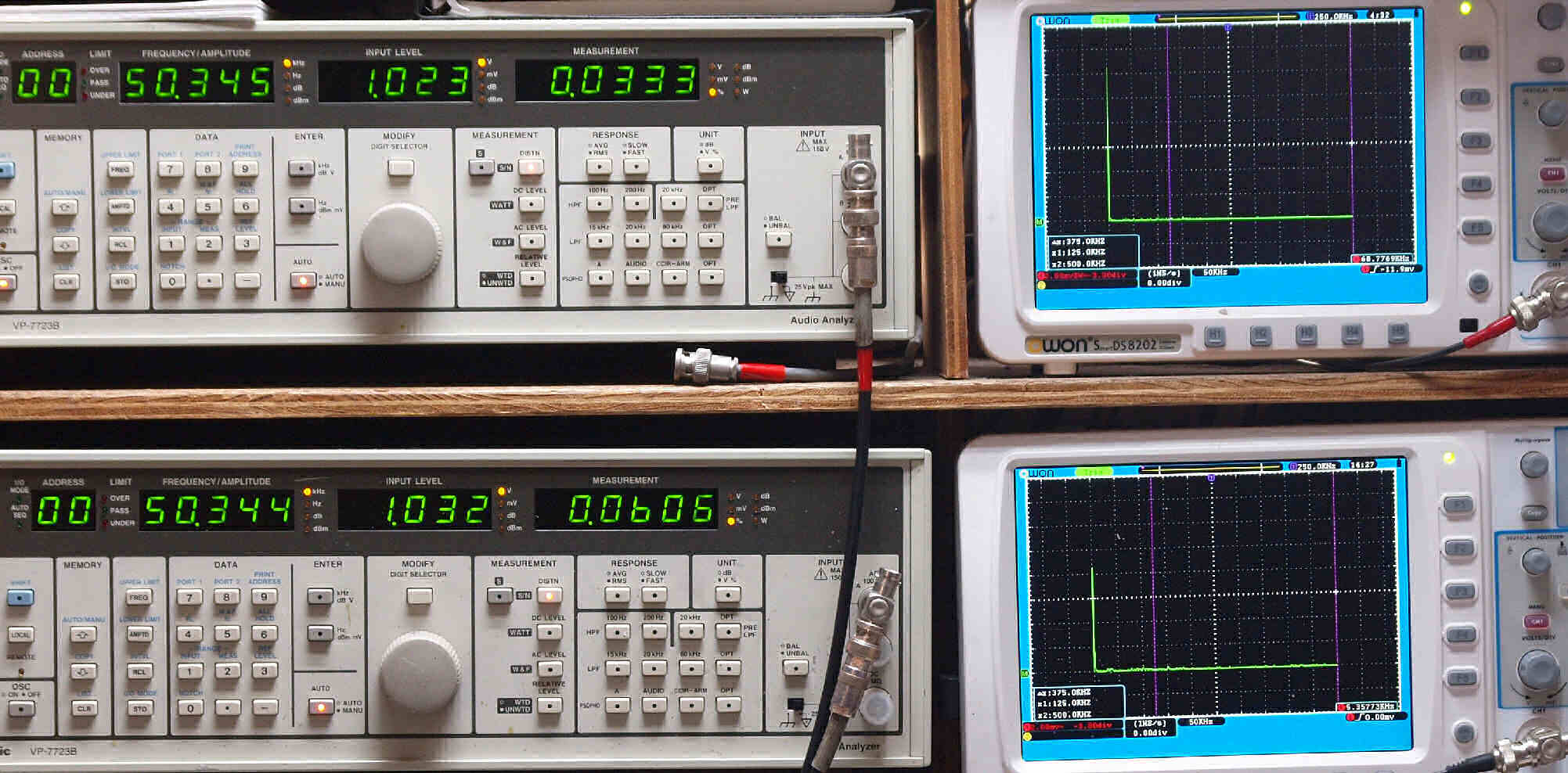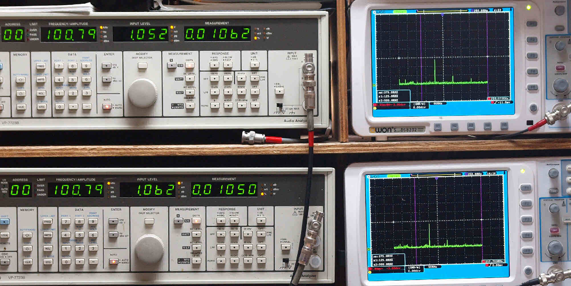| E. 調整・測定。 画像をクリックすると、大きく(横幅2050ドット)表示されます。 E1. 出力・歪み率測定・調整、「電源電圧は50HZ 100V」。 「見方」。 上段中 右側出力を「Audio Analyzer Panasonic VP−7723B」により測定。 表示LED、 左端=メモリーNo、 中左=周波数測定、 中右=出力電圧測定、 右端=歪み率測定。 上段右端 VP−7723Bの基本波除去出力を「owon SDS8202(200MHZ)」で「FFT分析」表示。 下段中 左側出力を「Audio Analyzer Panasonic VP−7723B」により測定。 表示LED、 左端=メモリーNo、 中左=周波数測定、 中右=出力電圧測定、 右端=歪み率測定。 下段右端 VP−7723Bの基本波除去出力を「owon SDS6062(200MHZ)」で「FFT分析」表示。 下段左端 オーディオ発振器 VP−7201A より50Hz〜100kHzの信号を出し(歪み率=約0.003%)、ATT+分配器を通し、AMPに入力。 よって、ダイアル設定出力レベルより低くなります。測定機器の仕様や整備の様子はこちら、「VP−7723B」「VP−7201A」。 FFT画面の見方はこちら。 |