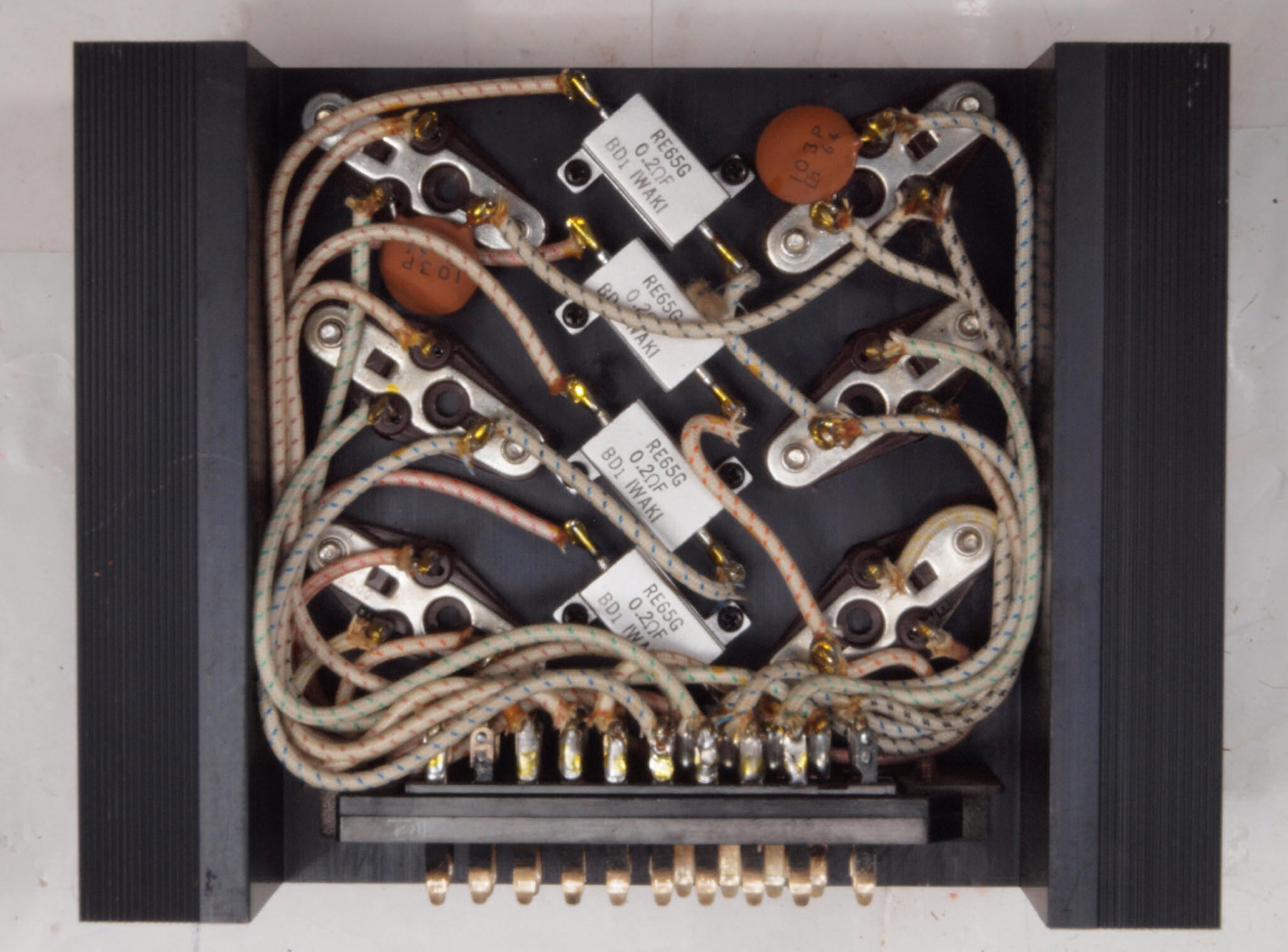 CL4. 修理後  SIT(静電誘導型トランジスター)用ブロック電解コンデンサー下周り。アースバーからのシャーシへのラグ端子固定ビスは黒ペイントビスから導通の良いメッキへビス交換。