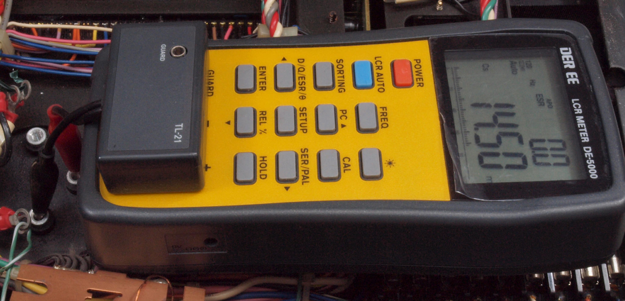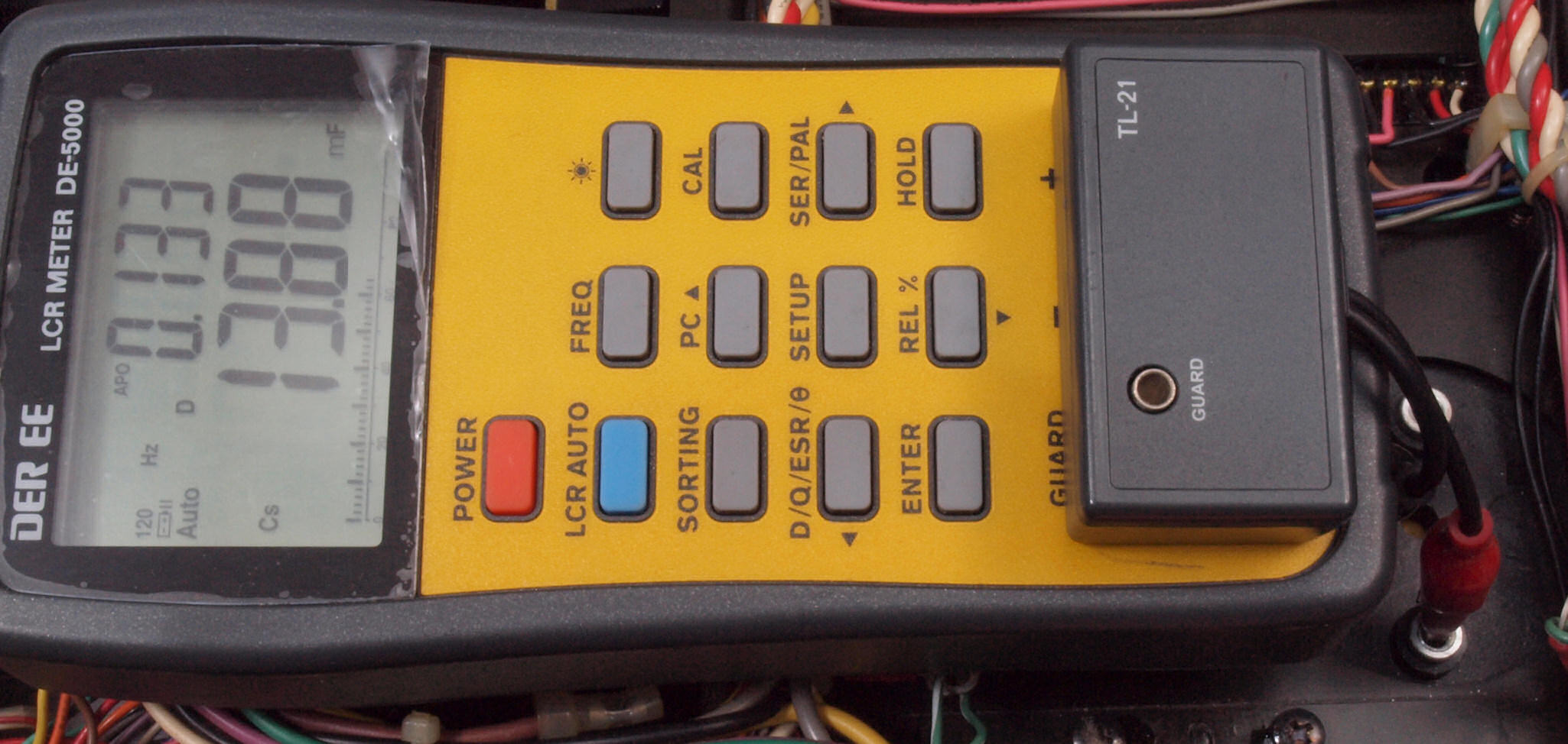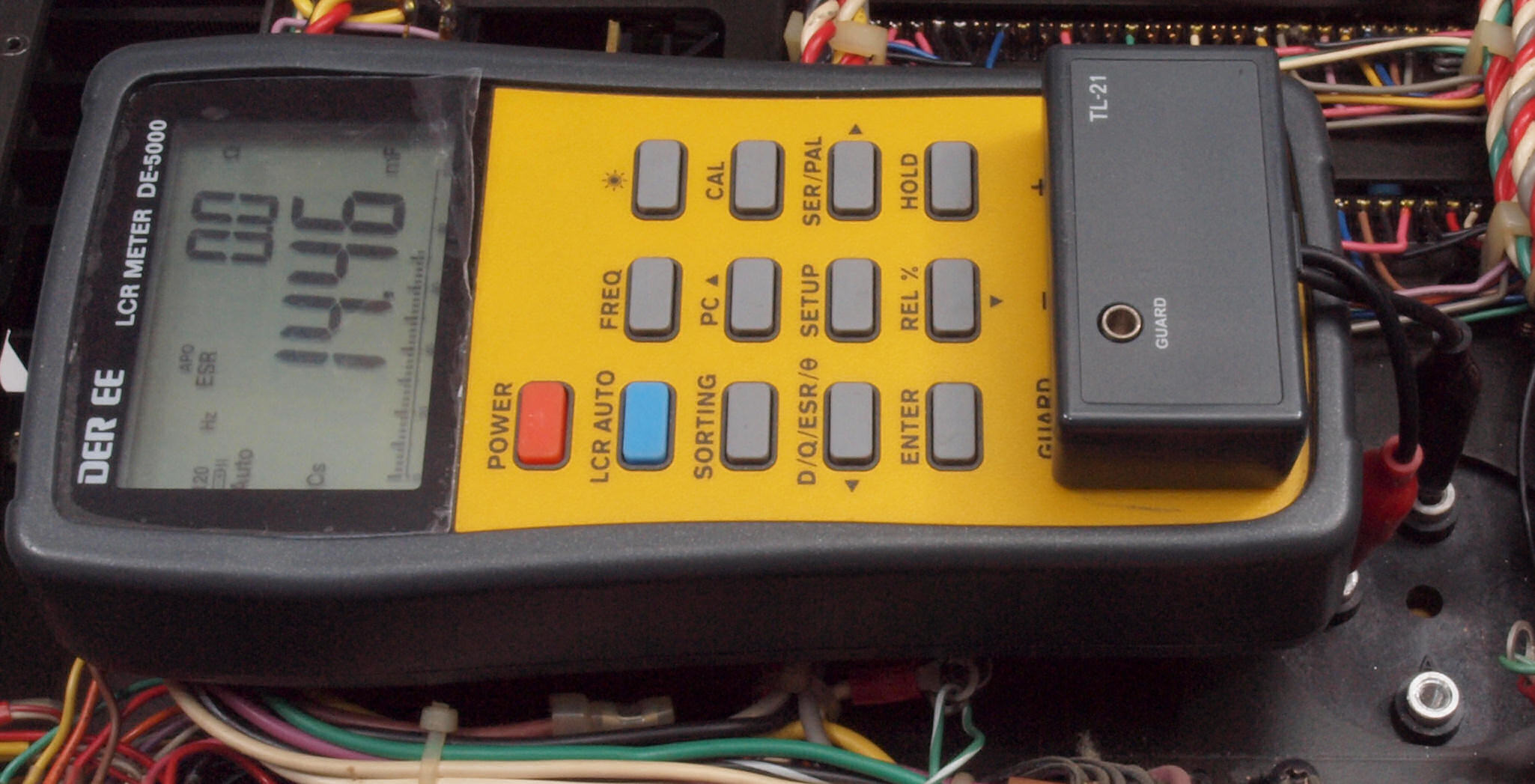 A52. 点検中、電源ブロック電解コンデンサー容量測定、 右側+側=14010μ/120HZ。