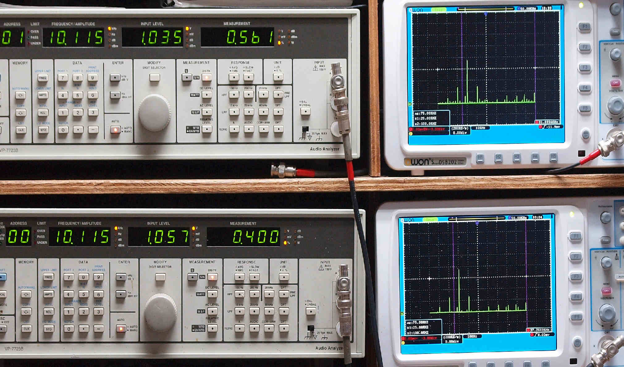 | E. 調整・測定 E1. 出力・歪み率測定・調整。 「見方」。 上段中 右側出力を「Audio Analyzer Panasonic VP−7723B」により測定。 表示LED、 左端=メモリーNo、 中左=周波数測定、 中右=出力電圧測定、 右端=歪み率測定。 上段右端 VP−7723Bの基本波除去出力を「owon SDS8202(200MHZ)」で「FFT分析」表示。 下段中 左側出力を「Audio Analyzer Panasonic VP−7723B」により測定。 表示LED、 左端=メモリーNo、 中左=周波数測定、 中右=出力電圧測定、 右端=歪み率測定。 下段右端 VP−7723Bの基本波除去出力を「owon SDS6062(200MHZ)」で「FFT分析」表示。 下段左端 オーディオ発振器 VP−7201A より50Hz〜100kHzの信号を出し(歪み率=約0.003%)、ATT+分配器を通し、AMPに入力。 よって、ダイアル設定出力レベルより低くなります。測定機器の仕様や整備の様子はこちら、「VP−7723B」「VP−7201A」。 FFT画面の見方はこちら。 |