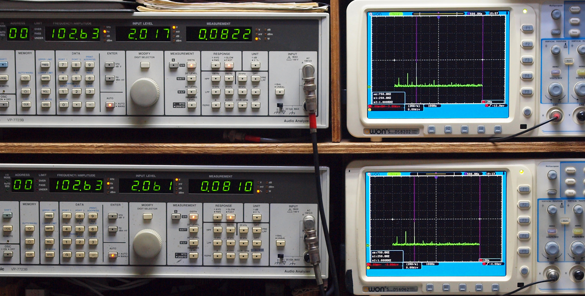 上段右端 VP−7723Bの基本波除去出力を「owon SDS8202(200MHZ)」で「FFT分析」表示。