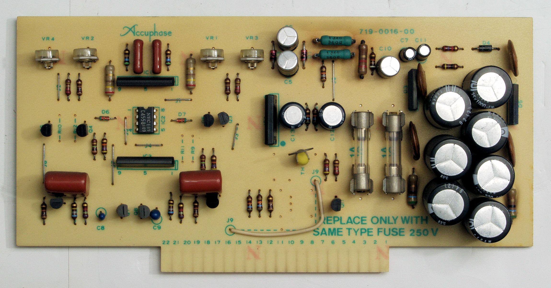 | C22. 修理後 R側ドライブ基板 初段FET、バランス・バイアス調整用半固定VR3個、電解コンデンサー6個交換 | ||||||||||||||||||||||||||