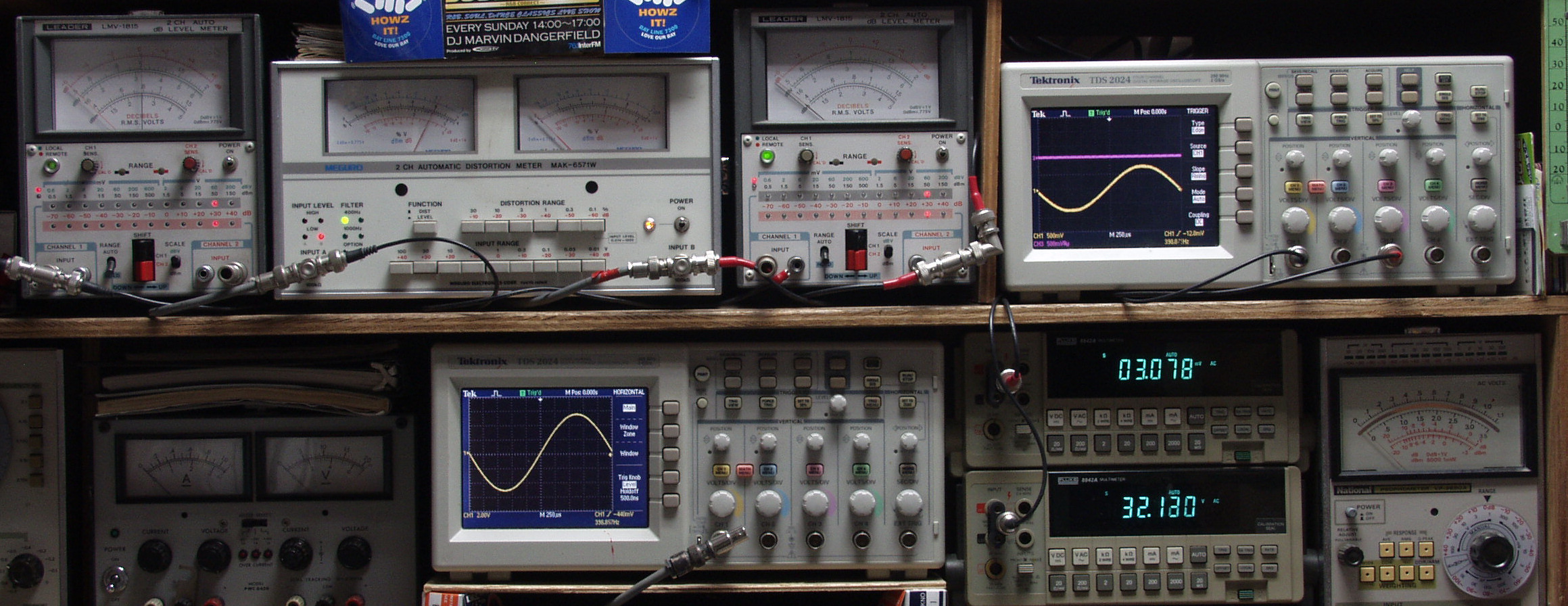 | T. 修理前点検測定 T1. 出力・歪み率測定。 「見方」。 下段左端 オーディオ発振器より400HZ・1KHZの信号を出し(歪み率=約0.003%)これをAMPに入力し、出力を測定。 下段中央 オシロ=入力波形(オーディオ発振器のTTLレベル表示)。 上段左端 交流電圧計=L側出力電圧測定、黒針のみ使用。 上段中左 歪み率計=出力の歪み率測定 左メータ=L出力、右メータ=R出力。 上段中右 交流電圧計=R側出力電圧測定、赤針のみ使用。 上段右端 オシロ=出力波形表示、 赤表示=R出力、黄色表示=L出力。(実際にはRL交流電圧計の出力「Max1V」を観測)。 下段中右上 デジタル電圧計=R出力電圧測定。 下段中右下 デジタル電圧計=L出力電圧測定。 |