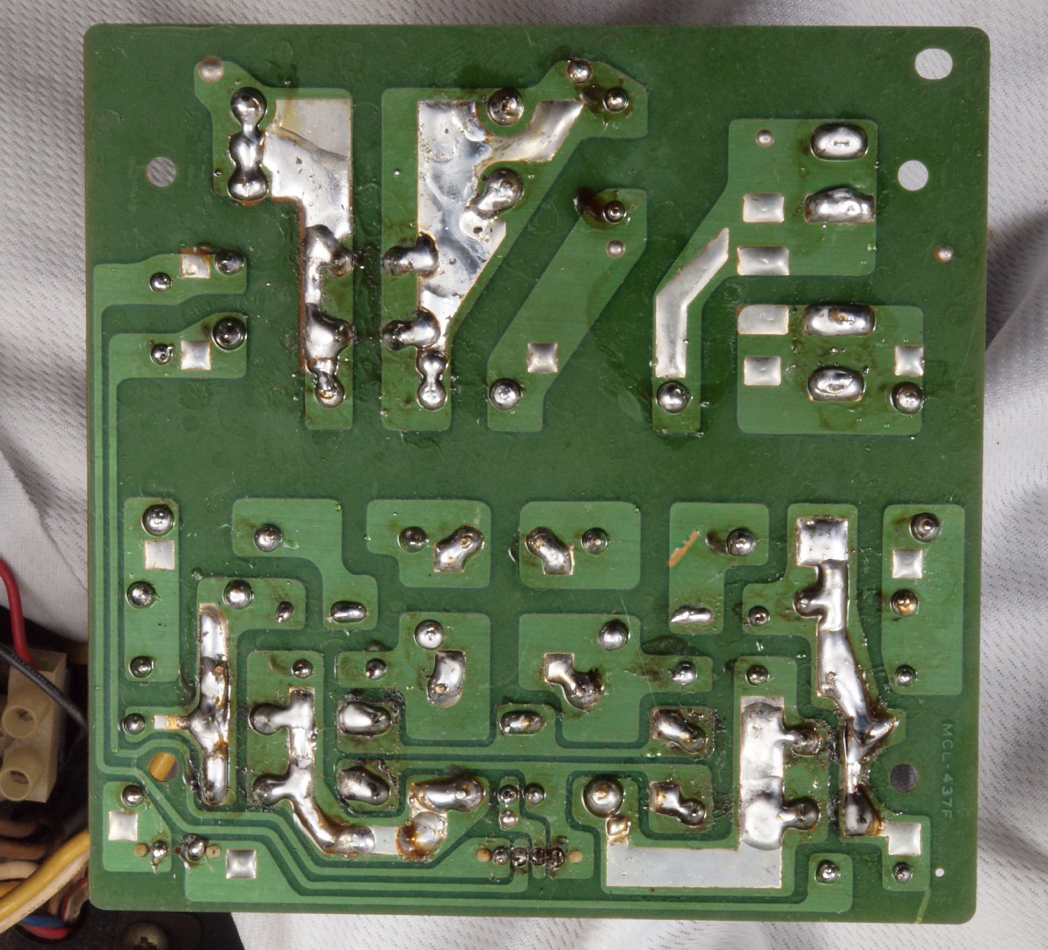 | CF4. 修理(半田補正)後 定電圧IC基板裏。 半田を全部やり直す。 | ||||||||||||||||||||||||||||||||||||||||||||||