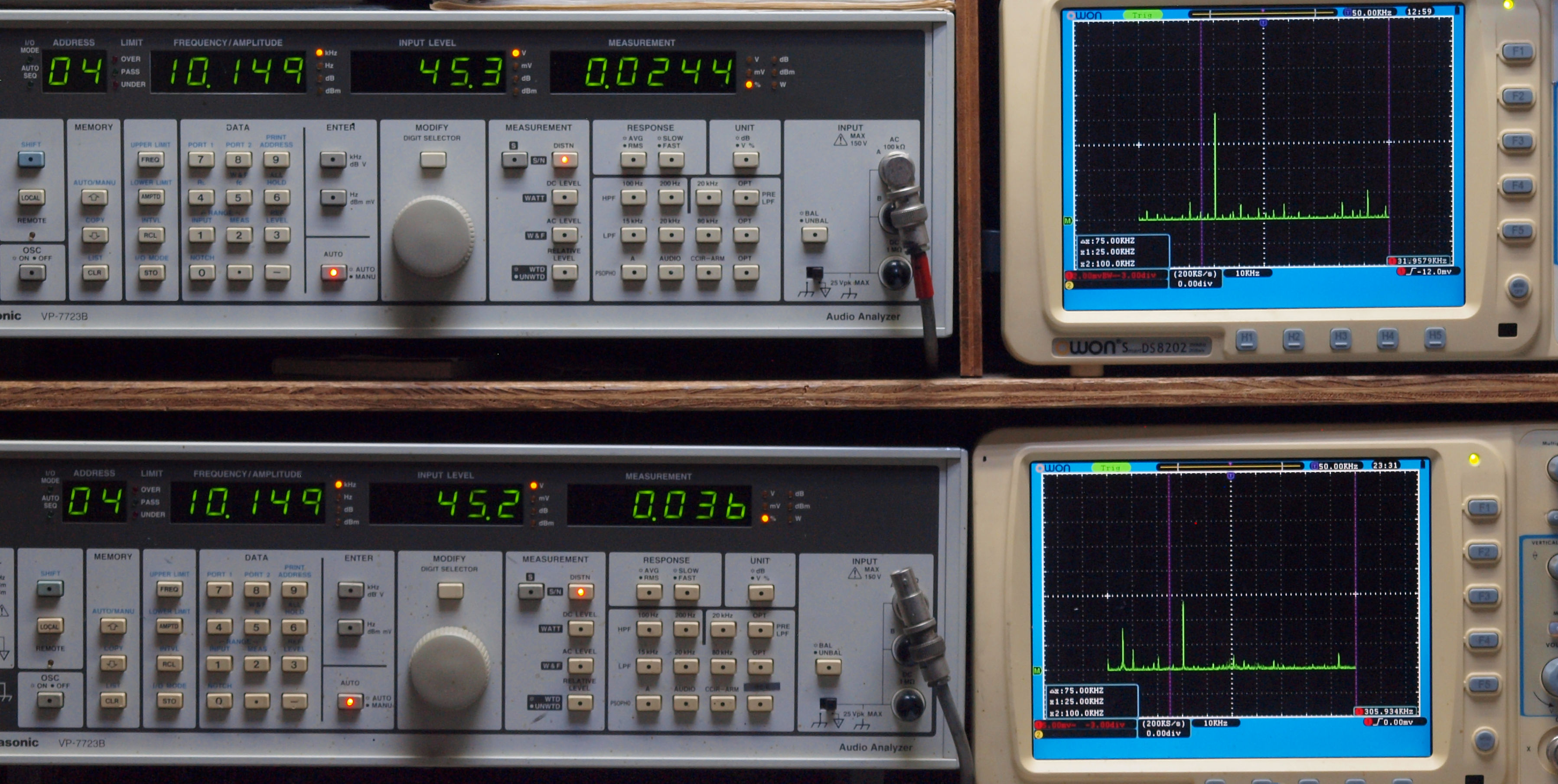 | E. 測定・調整。 画像をクリックすると、大きく(横幅2050ドット)表示されます。 E0. 出力・歪み率測定・調整。(株)高砂製作所 ARH1000 定電圧装置を使用して測定。 「見方」。 上段中 右側SP出力を「Audio Analyzer Panasonic VP−7723B」により測定。 表示LED、 左端=メモリーNo、 中左=周波数測定、 中右=出力電圧測定、 右端=歪み率測定。 上段右端 VP−7723Bの基本波除去出力を「owon SDS8202(200MHZ)」で「FFT分析」表示。 下段中 左側SP出力を「Audio Analyzer Panasonic VP−7723B」により測定。 表示LED、 左端=メモリーNo、 中左=周波数測定、 中右=出力電圧測定、 右端=歪み率測定。 下段右端 VP−7723Bの基本波除去出力を「owon SDS6062(200MHZ)」で「FFT分析」表示。 下段左端 オーディオ発振器 VP−7201A より50Hz〜100kHzの信号を出し(歪み率=約0.003%)、ATT+分配器を通し、AMPに入力。 よって、ダイアル設定出力レベルより低くなります。測定機器の仕様や整備の様子はこちら、「VP−7723B」「VP−7201A」。 FFT画面の見方はこちら。 |