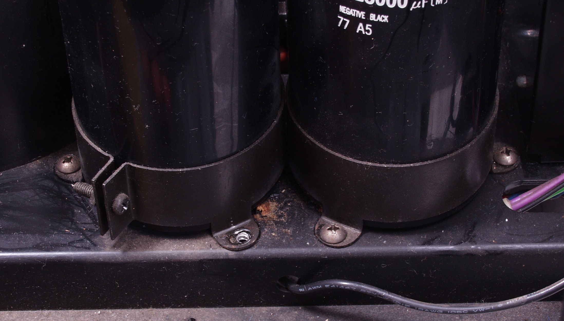 | A51. 点検中 R側電解コンデンサーがぐらついている、原因は止めネジ3本の内、1本が付けてない=左端のネジ穴 基板を取り外した形跡あり=下手なハンダ付け 液漏れでフューズホルダーが腐食している |