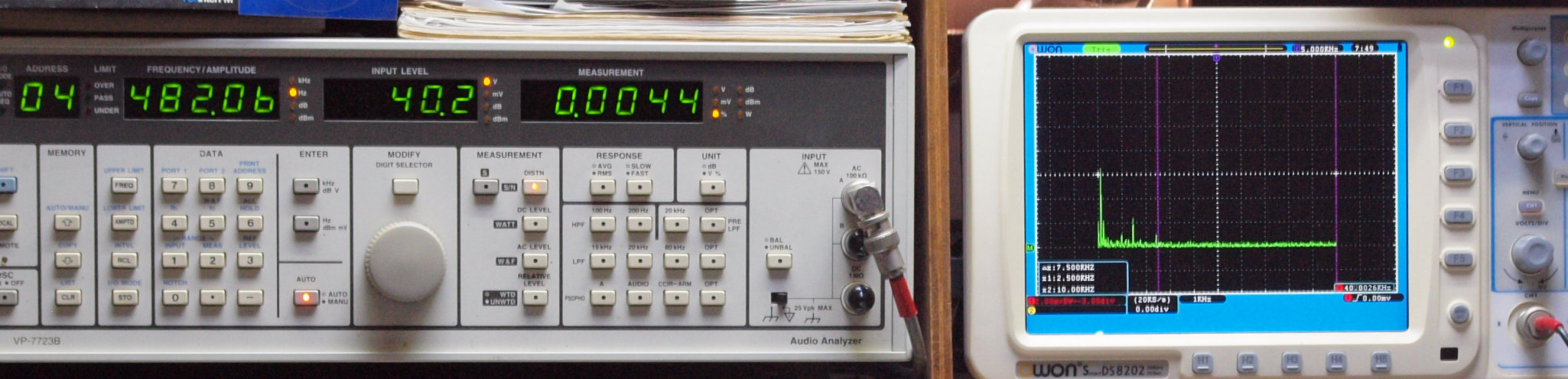 | E. 測定・調整。 画像をクリックすると、大きく(横幅2050ドット)表示されます。 E0. 出力・歪み率測定・調整 「見方」。 中..SP出力を「Audio Analyzer Panasonic VP−7723B」により測定。 表示LED、 左端=メモリーNo、 中左=周波数測定、 中右=出力電圧測定、 右端=歪み率測定。 右..VP−7723Bの基本波除去出力を「owon SDS6062(200MHZ)」で「FFT分析」表示。 左..オーディオ発振器 VP−7201A より50Hz〜100kHzの信号を出し(歪み率=約0.003%)、ATT+分配器を通し、AMPに入力。 よって、ダイアル設定出力レベルより低くなります。測定機器の仕様や整備の様子はこちら、「VP−7723B」「VP−7201A」。 FFT画面の見方はこちら。 |