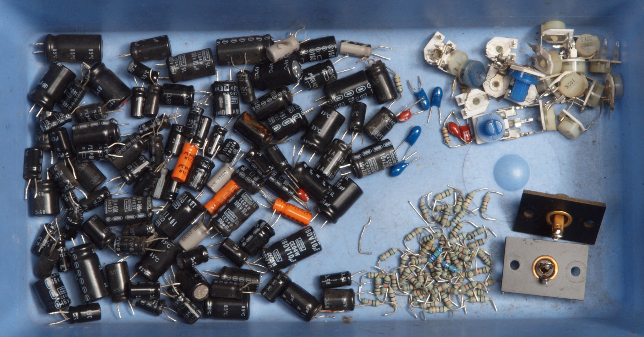 | AA1. 点検中 電解コンデンサー比較。 左=付いていた100μ/160V、 右=交換する330μ/160V。 | ||||||||||||||||||||||||||||||||||||||||||||||||||||||||