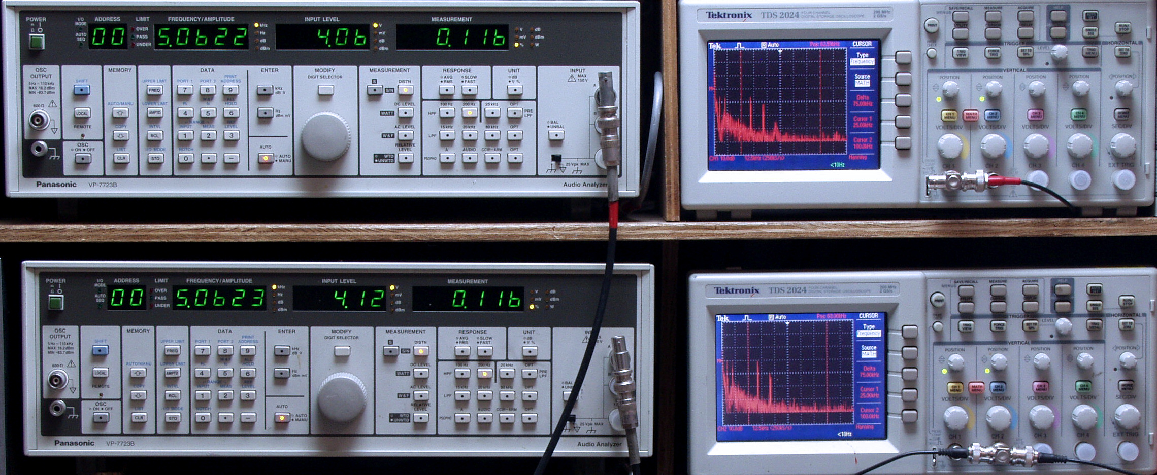 | E. 調整・測定 E1. 出力・歪み率測定 「見方」。 上段中 右側出力を「Audio Analyzer Panasonic VP−7723B」により測定。 表示LED、 左端=メモリーNo、 中左=周波数測定、 中右=出力電圧測定、 右端=歪み率測定。 上段右端 VP−7723Bの基本波除去出力を「Tektronix TDS−2024(200MHZ)」で「FFT分析」表示。 VP−7723Bで増幅された物を分析していますので、レベルは相対的比較です。 よって、測定条件が変わる場合は比較検討は無意味です 下段中 左側出力を「Audio Analyzer Panasonic VP−7723B」により測定。 表示LED、 左端=メモリーNo、 中左=周波数測定、 中右=出力電圧測定、 右端=歪み率測定。 下段右端 VP−7723Bの基本波除去出力を「Tektronix TDS−2024(200MHZ)」で「FFT分析」表示。 下段左端 オーディオ発振器 VP−7201A より100Hz〜10kHzの信号を出し(歪み率=約0.003%)、ATT+分配器を通し、AMPに入力。 よって、ダイアル設定出力レベルより低くなります。測定機器の仕様や整備の様子はこちら、「VP−7723B」「VP−7201A」 |