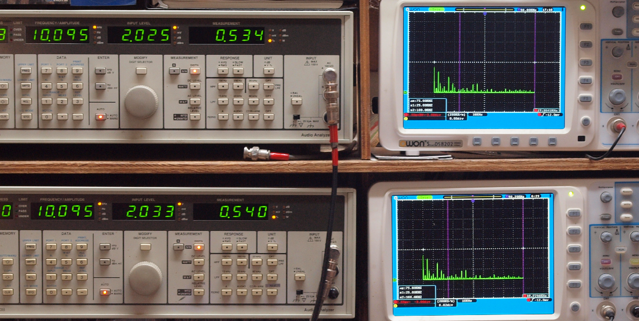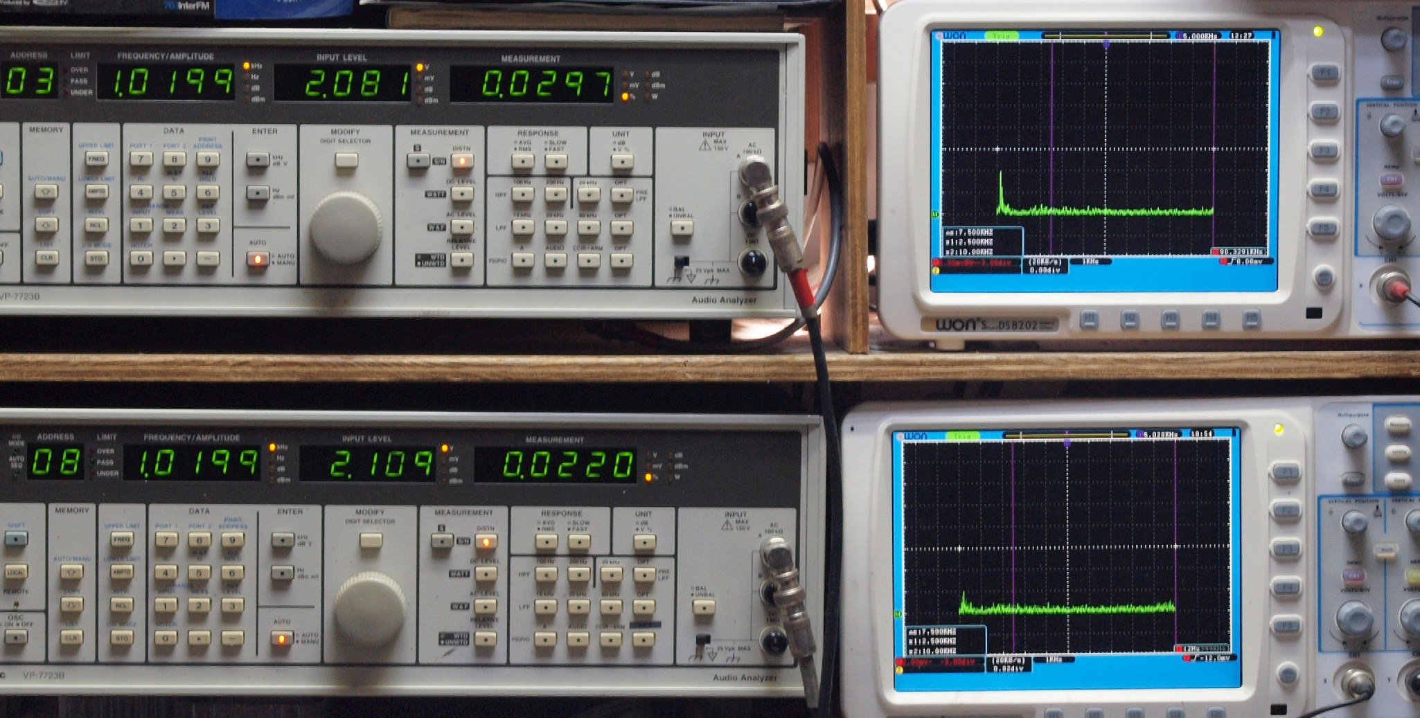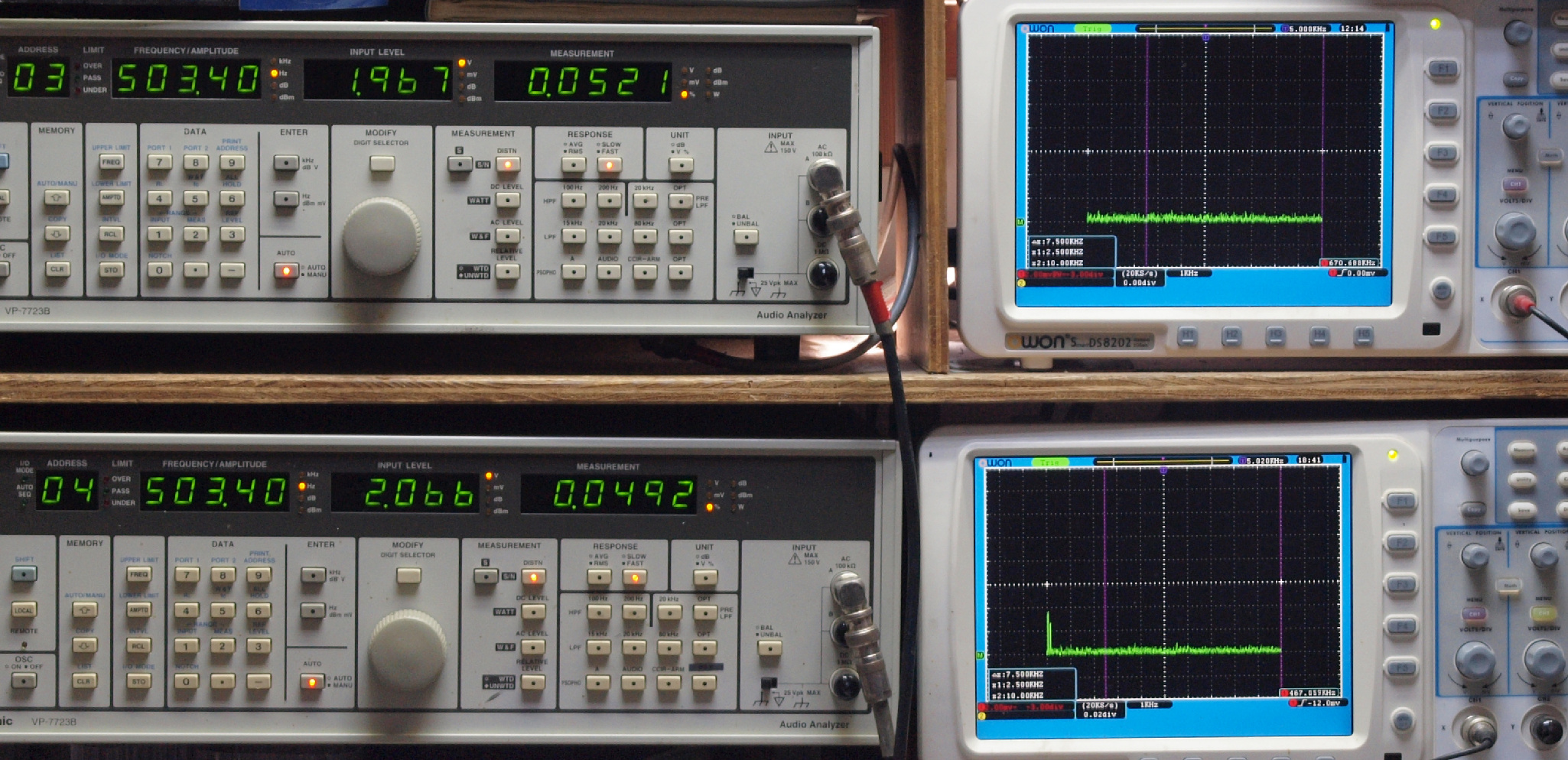 | E. 調整・測定。 画像をクリックすると、大きく(横幅2050ドット)表示されます。 E0. 出力・歪み率測定・調整。 「見方」。 上段中 右側SP出力を「Audio Analyzer Panasonic VP−7723B」により測定。 表示LED、 左端=メモリーNo、 中左=周波数測定、 中右=出力電圧測定、 右端=歪み率測定。 上段右端 VP−7723Bの基本波除去出力を「owon SDS8202(200MHZ)」で「FFT分析」表示。 下段中 左側SP出力を「Audio Analyzer Panasonic VP−7723B」により測定。 表示LED、 左端=メモリーNo、 中左=周波数測定、 中右=出力電圧測定、 右端=歪み率測定。 下段右端 VP−7723Bの基本波除去出力を「owon SDS6062(200MHZ)」で「FFT分析」表示。 下段左端 オーディオ発振器 VP−7201A より50Hz〜100kHzの信号を出し(歪み率=約0.003%)、ATT+分配器を通し、AMPに入力。 よって、ダイアル設定出力レベルより低くなります。測定機器の仕様や整備の様子はこちら、「VP−7723B」「VP−7201A」。 FFT画面の見方はこちら。 |