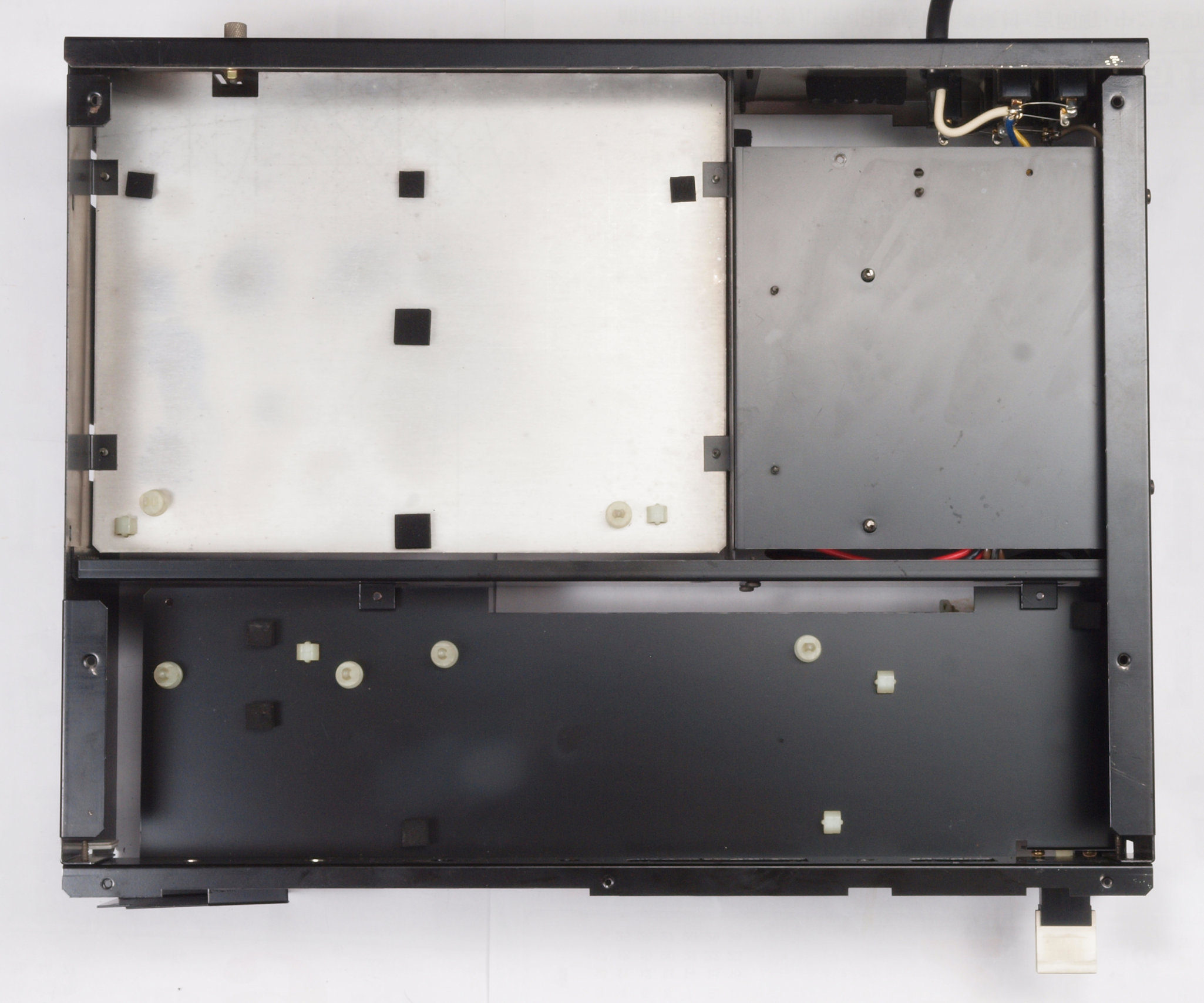 | C. 修理状況。 画像をクリックすると、大きく(横幅2050ドット)表示されます。 C01. 修理中 基板を全て取り除いたシャーシを上から見る。 |