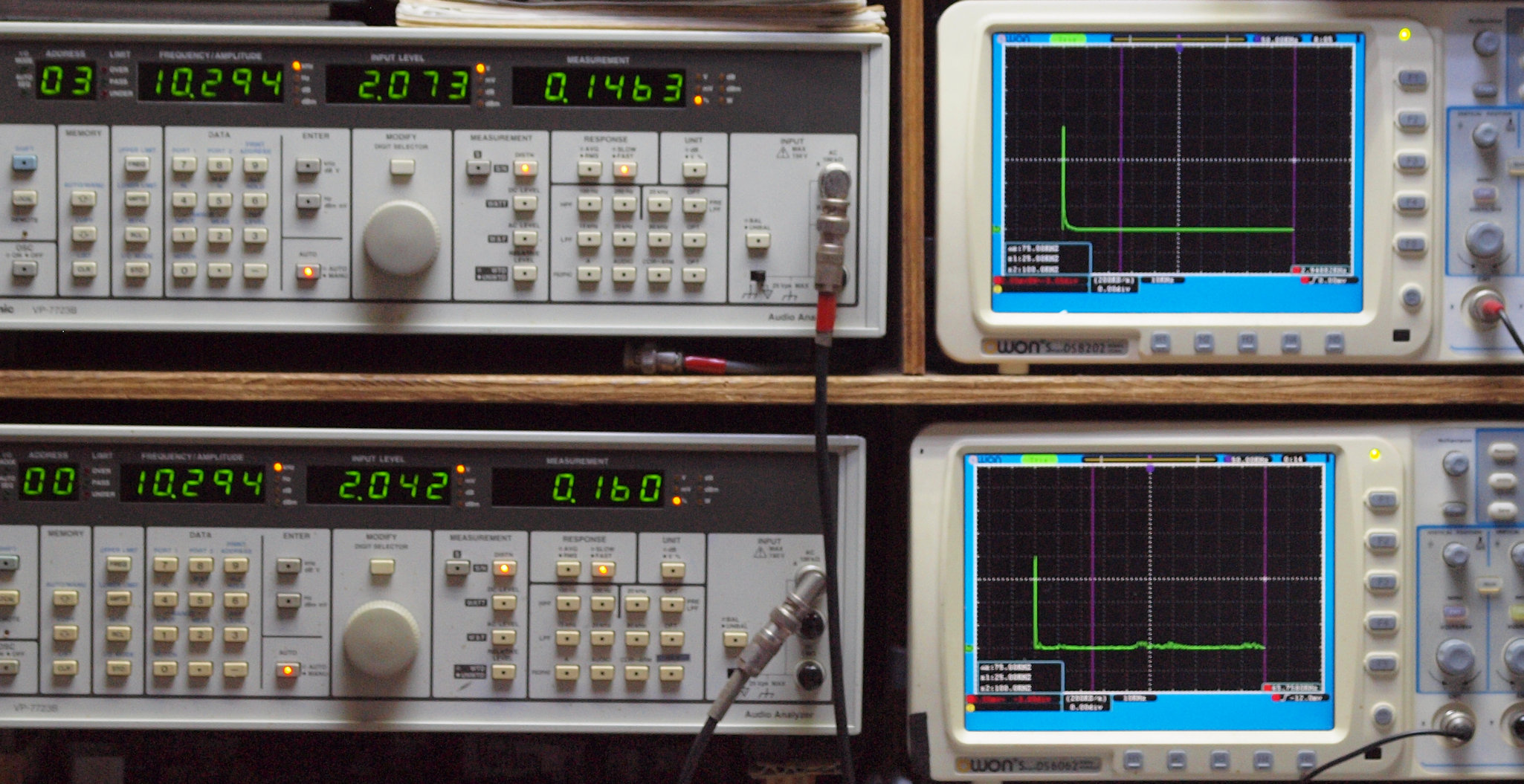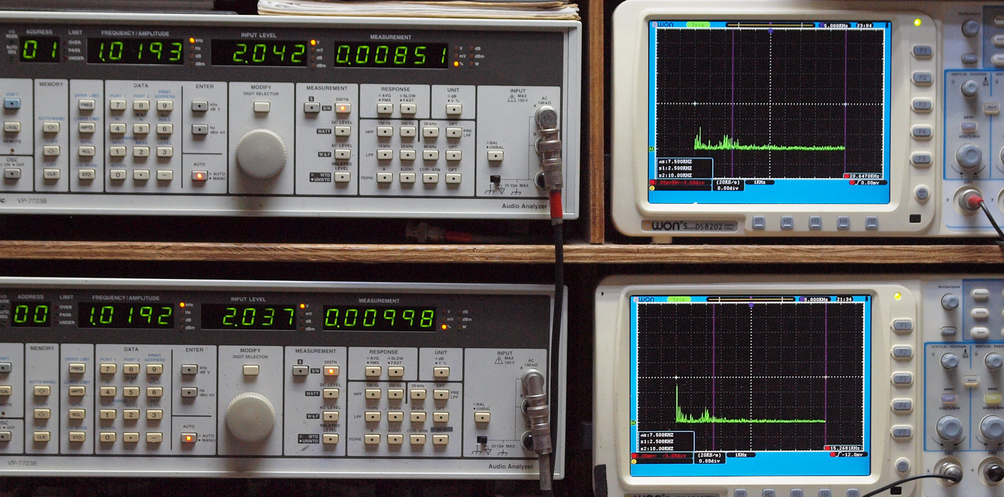| E. 調整・測定。 画像をクリックすると、大きく(横幅2050ドット)表示されます。 E0. 出力・歪み率測定・調整。 「見方」。 上段中 右側SP出力を「Audio Analyzer Panasonic VP−7723B」により測定。 表示LED、 左端=メモリーNo、 中左=周波数測定、 中右=出力電圧測定、 右端=歪み率測定。 上段右端 VP−7723Bの基本波除去出力を「owon SDS8202(200MHZ)」で「FFT分析」表示。 下段中 左側SP出力を「Audio Analyzer Panasonic VP−7723B」により測定。 表示LED、 左端=メモリーNo、 中左=周波数測定、 中右=出力電圧測定、 右端=歪み率測定。 下段右端 VP−7723Bの基本波除去出力を「owon SDS6062(200MHZ)」で「FFT分析」表示。 下段左端 オーディオ発振器 VP−7201A より50Hz〜100kHzの信号を出し(歪み率=約0.003%)、ATT+分配器を通し、AMPに入力。 よって、ダイアル設定出力レベルより低くなります。測定機器の仕様や整備の様子はこちら、「VP−7723B」「VP−7201A」。 FFT画面の見方はこちら。 |