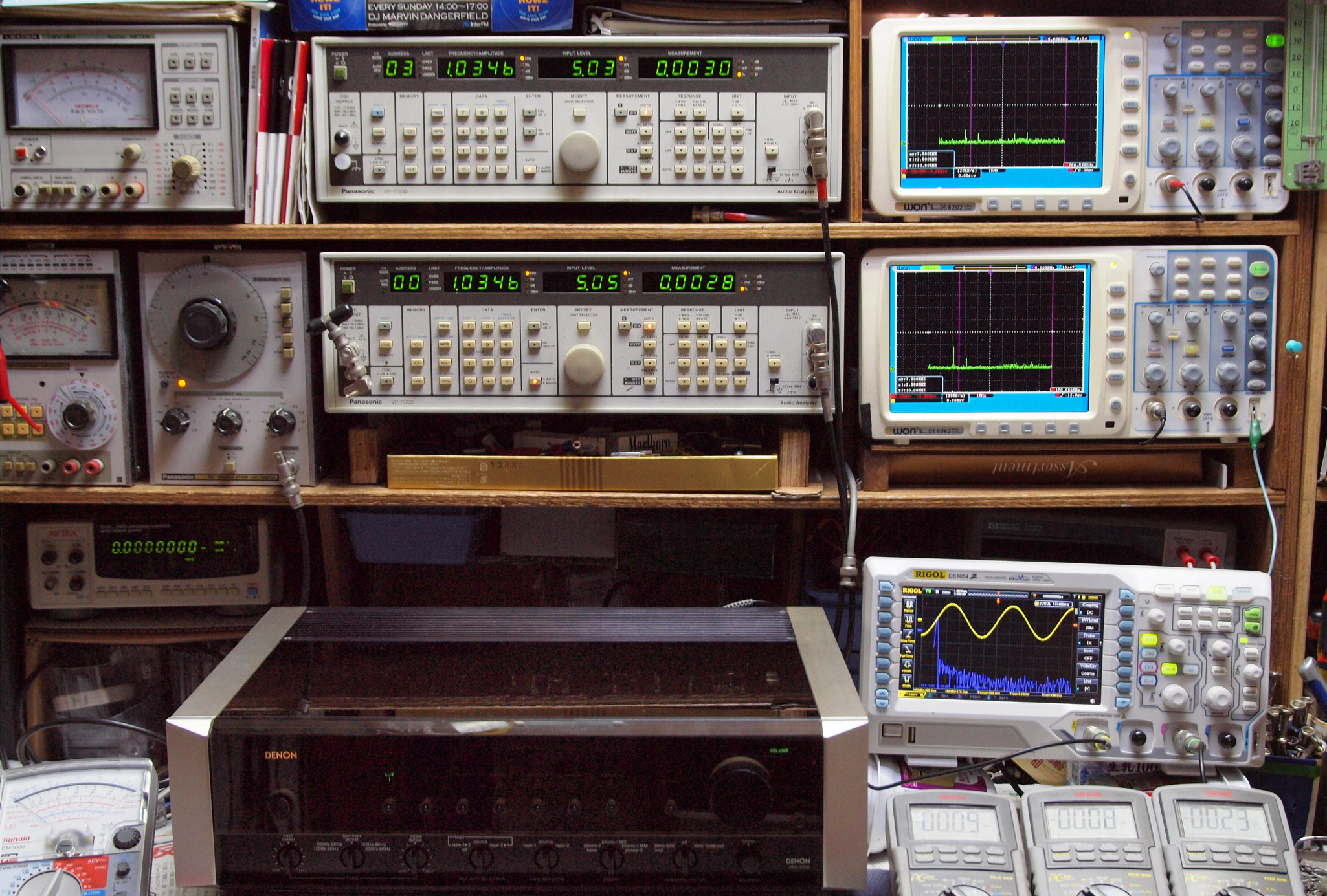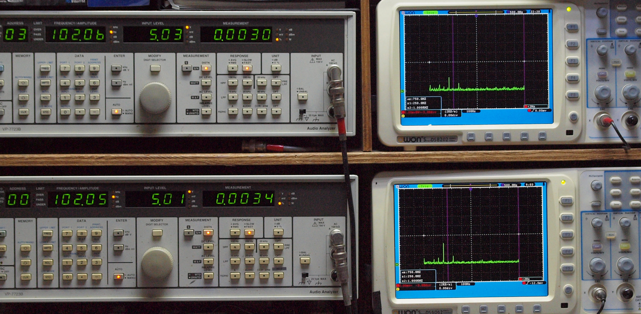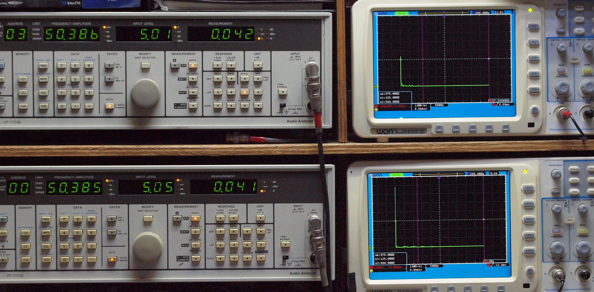 | E. 調整・測定。 画像をクリックすると、大きく(横幅2050ドット)表示されます。 E0. 出力・歪み率測定・調整。 「見方」。 上段中 右側出力を「Audio Analyzer Panasonic VP−7723B」により測定。 表示LED、 左端=メモリーNo、 中左=周波数測定、 中右=出力電圧測定、 右端=歪み率測定。 上段右端 VP−7723Bの基本波除去出力を「owon SDS8202(200MHZ)」で「FFT分析」表示。 下段中 左側出力を「Audio Analyzer Panasonic VP−7723B」により測定。 表示LED、 左端=メモリーNo、 中左=周波数測定、 中右=出力電圧測定、 右端=歪み率測定。 下段右端 VP−7723Bの基本波除去出力を「owon SDS6062(200MHZ)」で「FFT分析」表示。 下段左端 オーディオ発振器 VP−7201A より50Hz〜100kHzの信号を出し(歪み率=約0.003%)、ATT+分配器を通し、AMPに入力。 よって、ダイアル設定出力レベルより低くなります。測定機器の仕様や整備の様子はこちら、「VP−7723B」「VP−7201A」。 FFT画面の見方はこちら。 |
