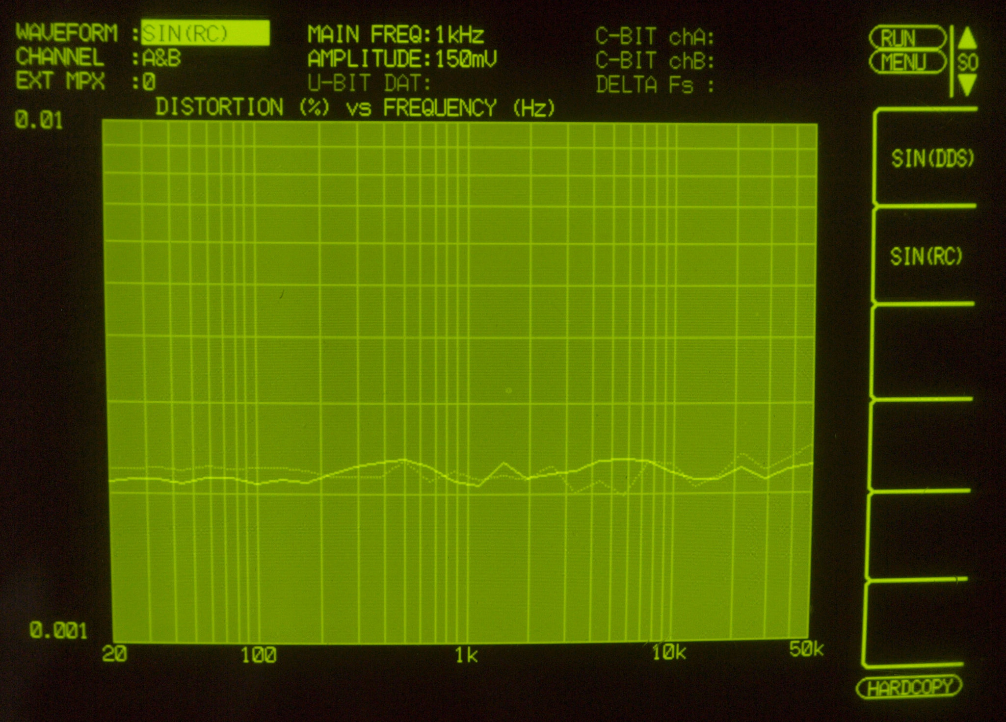 | E31. MC_50Hz入力、R側出力電圧=5V、 0.0071%歪み。 PHONO_1入力、L側出力電圧=5V、 0.0065%歪み。 「FFT分析」のオシロのカーソル周波数、左=250Hz、右=1kHz。 |