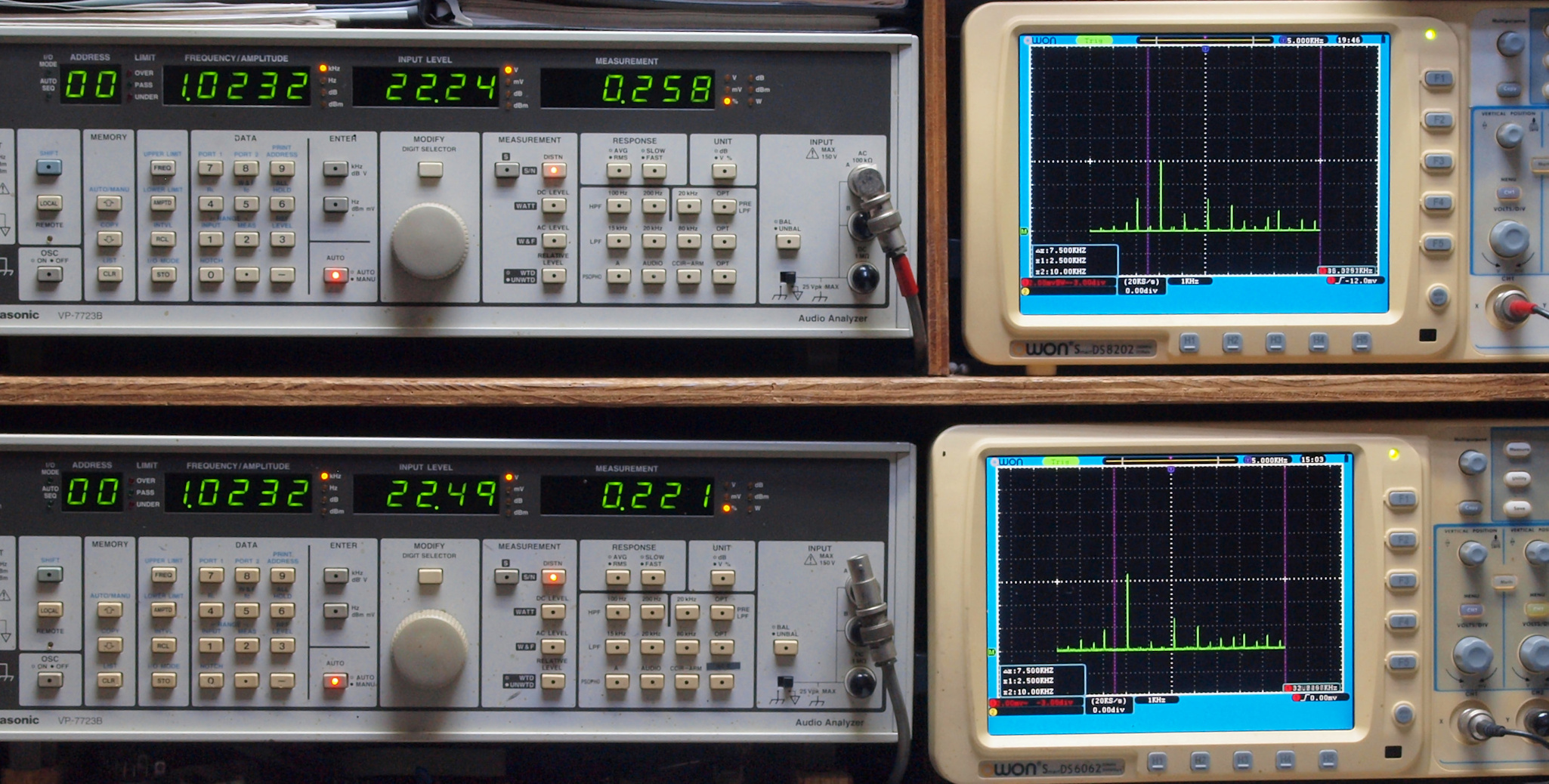 | E. 測定・調整。 画像をクリックすると、大きく(横幅2050ドット)表示されます。 E0. 出力・歪み率測定・調整 「見方」。 上段中 右側SP出力を「Audio Analyzer Panasonic VP−7723B」により測定。 表示LED、 左端=メモリーNo、 中左=周波数測定、 中右=出力電圧測定、 右端=歪み率測定。 上段右端 VP−7723Bの基本波除去出力を「owon SDS8202(200MHZ)」で「FFT分析」表示。 下段中 左側SP出力を「Audio Analyzer Panasonic VP−7723B」により測定。 表示LED、 左端=メモリーNo、 中左=周波数測定、 中右=出力電圧測定、 右端=歪み率測定。 下段右端 VP−7723Bの基本波除去出力を「owon SDS6062(200MHZ)」で「FFT分析」表示。 下段左端 オーディオ発振器 VP−7201A より50Hz〜100kHzの信号を出し(歪み率=約0.003%)、ATT+分配器を通し、AMPに入力。 よって、ダイアル設定出力レベルより低なります。測定機器の仕様や整備の様子はこちら、「VP−7723B」「VP−7201A」。 FFT画面の見方はこちら。 |