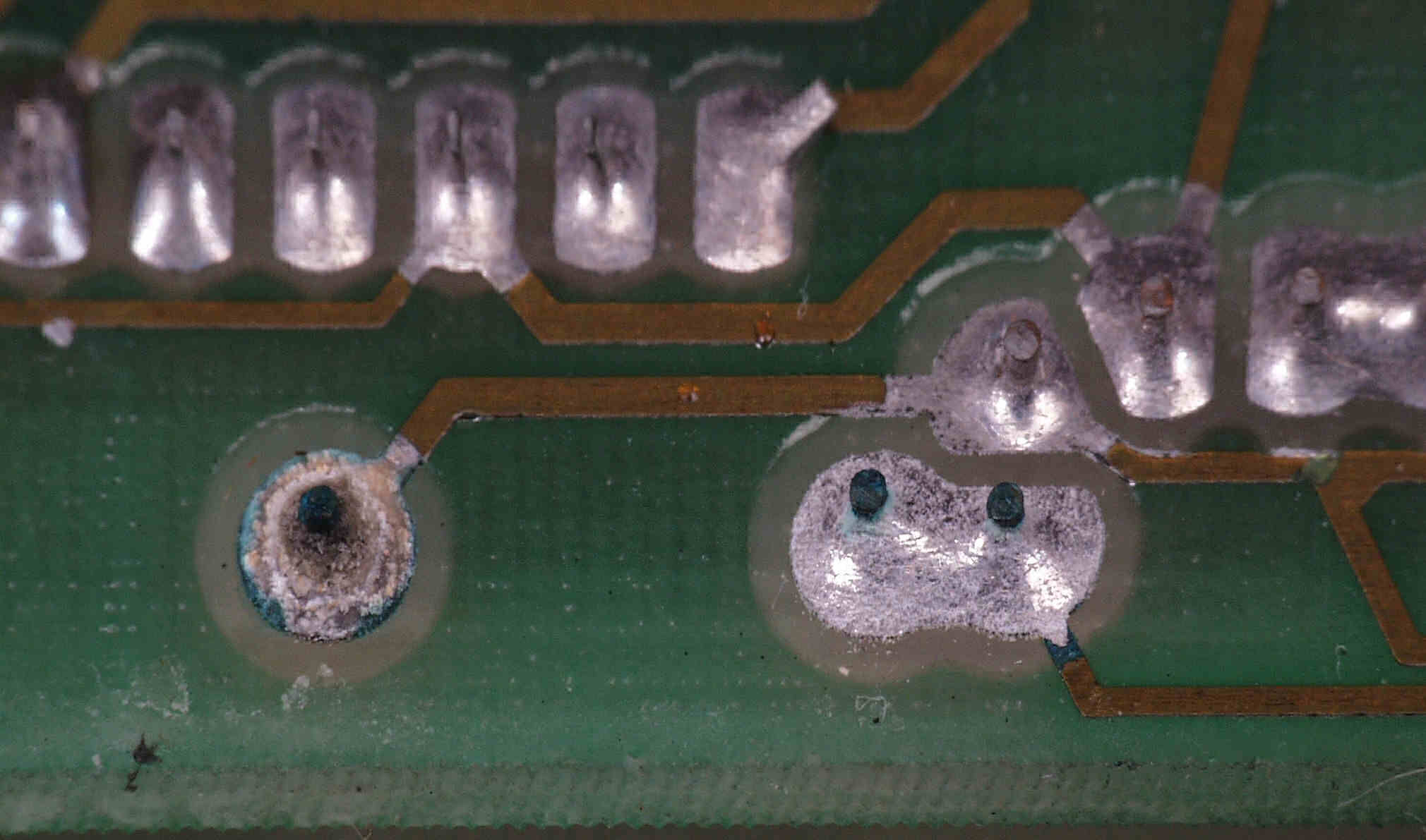 | C333. 修理前 定電圧・制御基板裏、洗浄不足が原因の半田腐食、やがて接触不良になる | ||||||||||||||||||||||||||||||||||