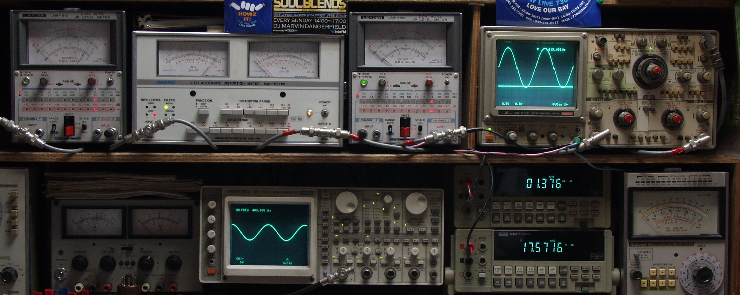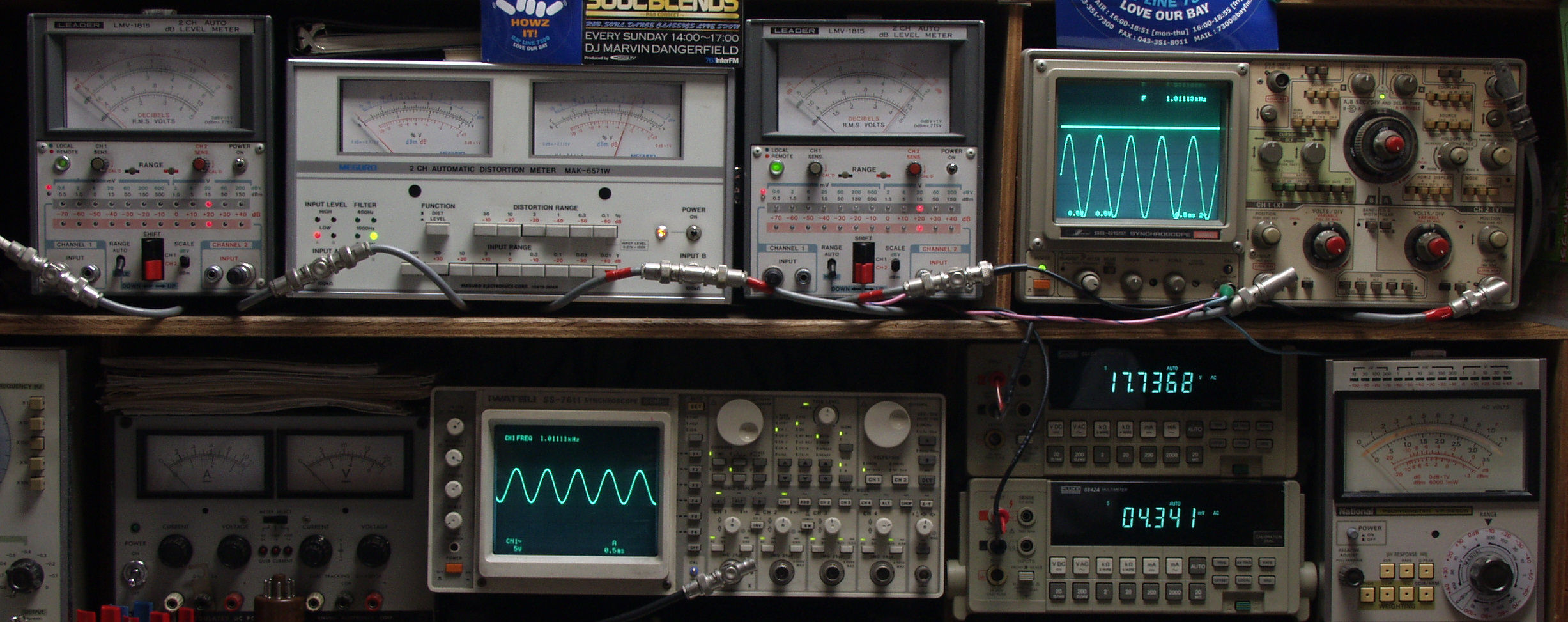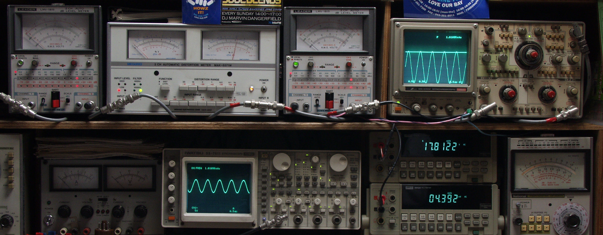 | U. 修理前点検測定2 U0. 出力・歪み率測定2 <見方> 下段左端 オーディオ発振器より400HZ・1KHZの信号を出し(歪み率=約0.003%)これをAMPに入力し、出力を測定。 下段中左 オシロ=入力波形(オーディオ発振器のTTLレベル)。 下段中右上=周波数計。 上段左端 電圧計=L側出力電圧測定、黒針のみ使用。 上段中左 歪み率計=出力の歪み率測定、 左メータ=L出力、右メータ=R出力。 上段中右 電圧計=R側出力電圧測定、赤針のみ使用。 上段右端 オシロ=出力波形、 上=R出力、下=L出力(実際にはRL電圧計の出力「Max1V」を観測)。 下段中右上 デジタル電圧計=R出力電圧測定。 下段中右下 デジタル電圧計=L出力電圧測定。 右下のデジタルオシロはデモで拝借YOKOGAWA DLM2024 |