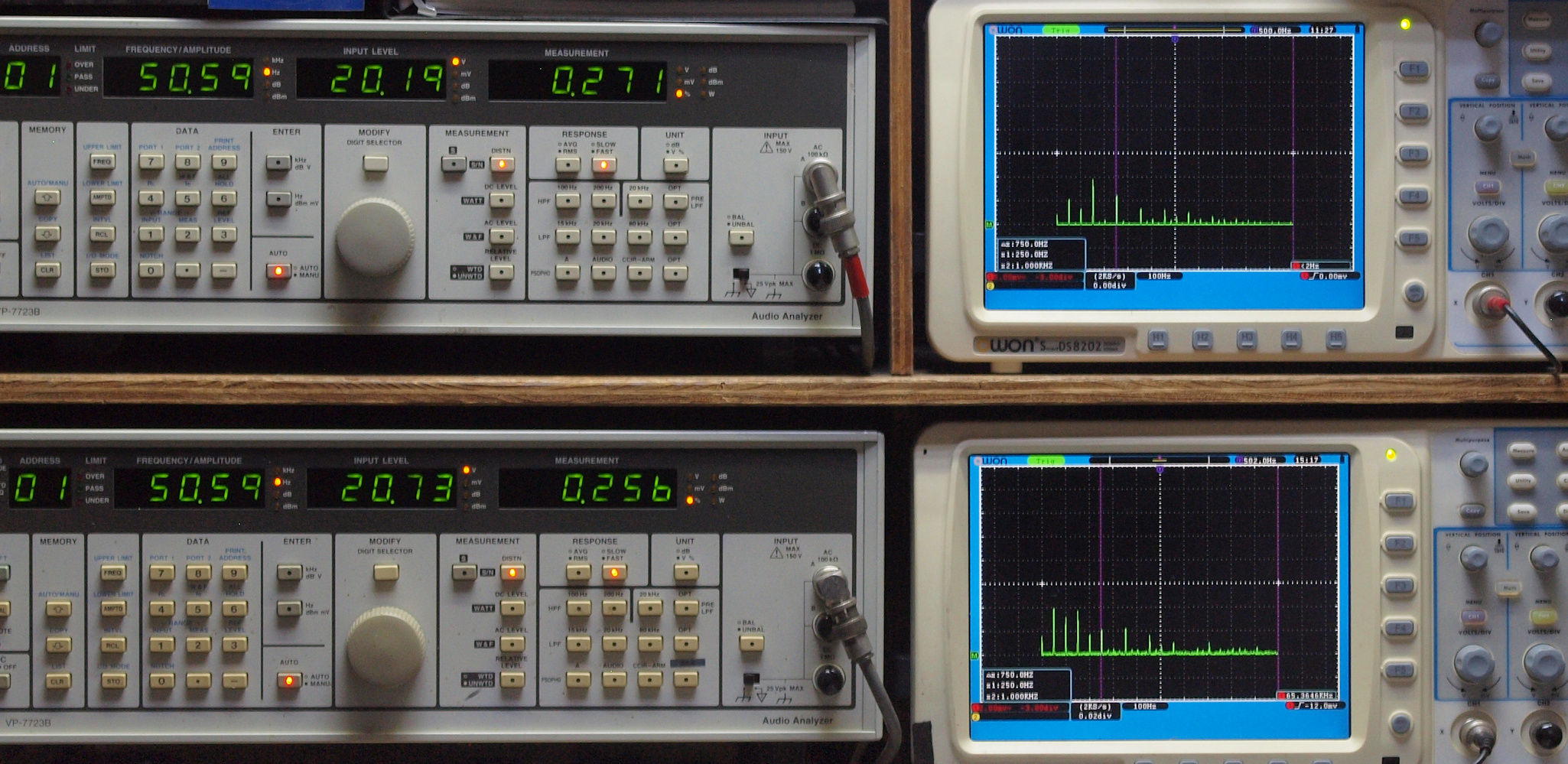 | E. 測定・調整。 画像をクリックすると、大きく(横幅2050ドット)表示されます。 E0. 出力・歪み率測定・調整。 電源はAC100Vで測定。 「見方」。 上段中 右側SP出力を「Audio Analyzer Panasonic VP−7723B」により測定。 表示LED、 左端=メモリーNo、 中左=周波数測定、 中右=出力電圧測定、 右端=歪み率測定。 上段右端 VP−7723Bの基本波除去出力を「owon SDS8202(200MHZ)」で「FFT分析」表示。 下段中 左側SP出力を「Audio Analyzer Panasonic VP−7723B」により測定。 表示LED、 左端=メモリーNo、 中左=周波数測定、 中右=出力電圧測定、 右端=歪み率測定。 下段右端 VP−7723Bの基本波除去出力を「owon SDS6062(200MHZ)」で「FFT分析」表示。 下段左端 オーディオ発振器 VP−7201A より50Hz〜100kHzの信号を出し(歪み率=約0.003%)、ATT+分配器を通し、AMPに入力。 よって、ダイアル設定出力レベルより低くなります。測定機器の仕様や整備の様子はこちら、「VP−7723B」「VP−7201A」。 FFT画面の見方はこちら。 |